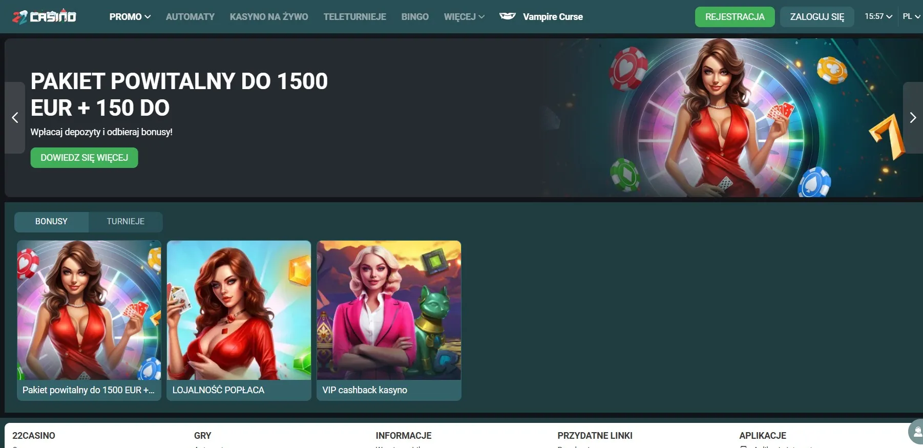 Kasyno online 22Casino działa od 2018 roku. Serwis udostępnia ponad 10 000 gier, w tym automaty, stoły karciane i sekcję live casino. Platforma oferuje aplikację na iOS i Android, a program VIP przewiduje cashback do 11%. Dostępne są szybkie metody płatności i całodobowa obsługa klienta w języku polskim. Gry pochodzą od renomowanych dostawców. Strona kasyna jest przetłumaczona na ponad 60 języków. Poniższa recenzja 22Casino dla polskich graczy w 2026 roku szczegółową przedstawia ofertę operatora.