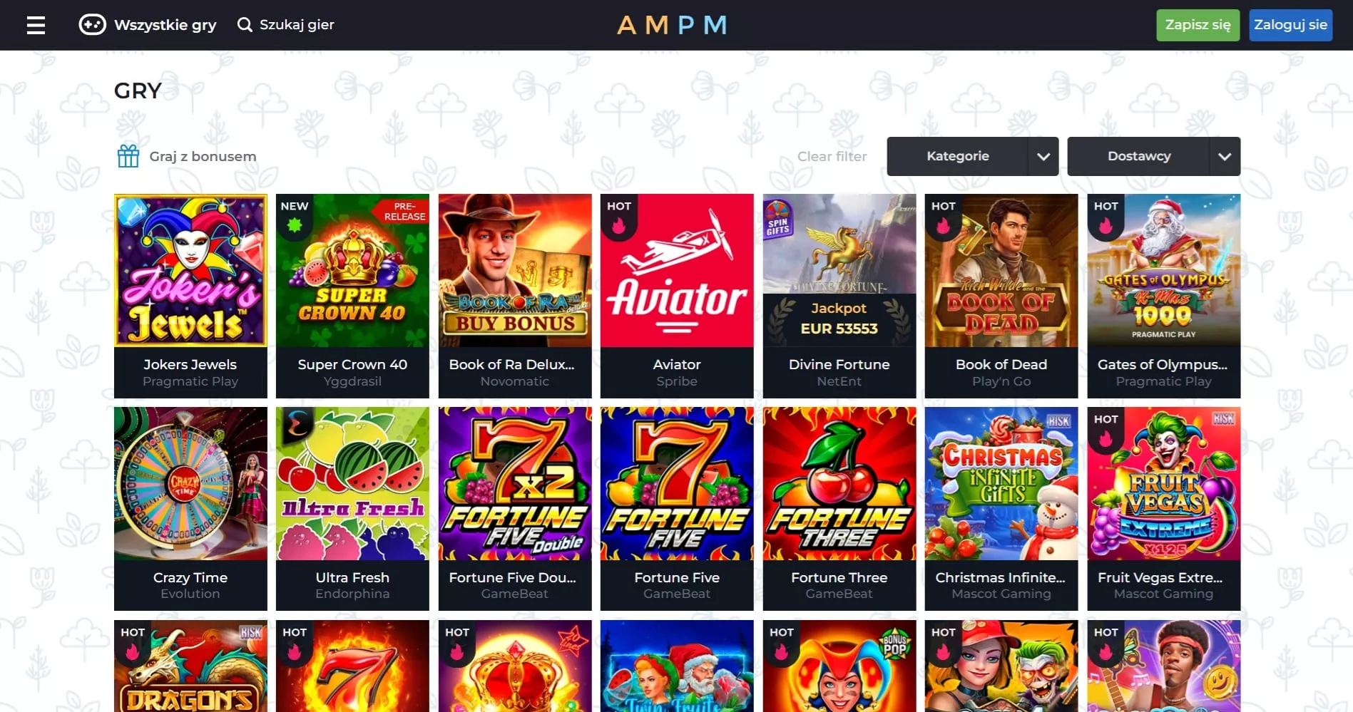 Podczas testów wykonanych przez ekspertów Dobramine sprawdziliśmy pełną bibliotekę gier dostępnych na stronie kasyna AMPM. Platforma oferuje ponad 5000 tytułów od około 70 dostawców, w tym najpopularniejszych twórców jak Pragmatic Play, NetEnt, Play’n GO czy Spinomenal. W porównaniu z innymi kasynami online, AMPM wyróżnia się nie tylko liczbą gier, ale również różnorodnością kategorii, co pozwala graczom dobrać rozrywkę do własnych preferencji.