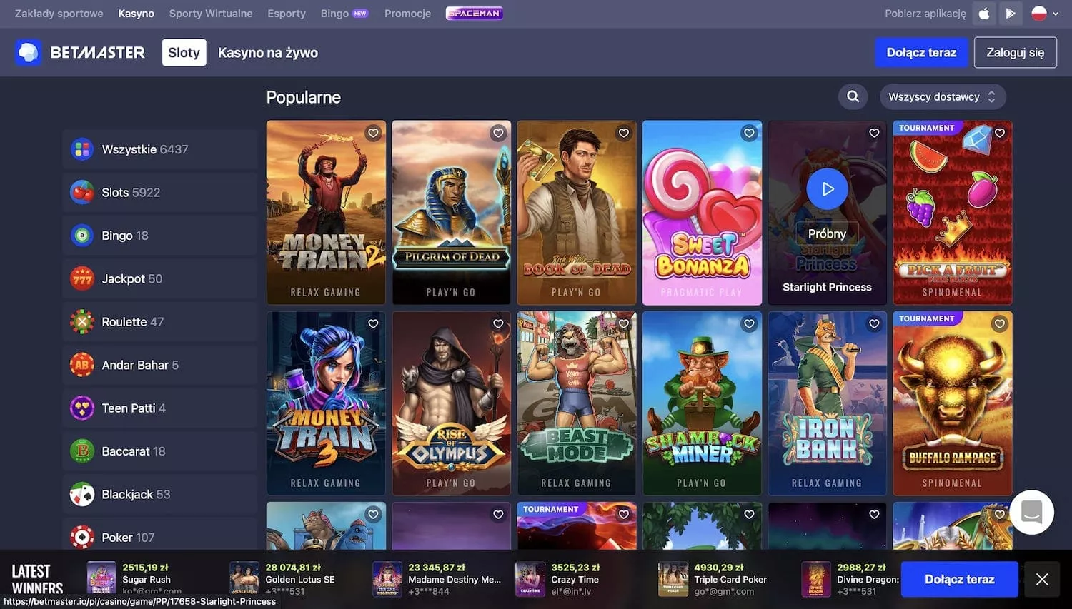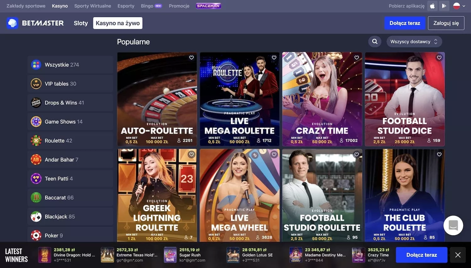 Betmaster współpracuje z ponad 25 dostawcami gier, aby każdy znalazł takie gry, jakie lubi. Najpopularniejsze z nich to Evolution Gaming, NetEnt, Microgaming, Evoplay, Play n Go i Pragmatic Play.