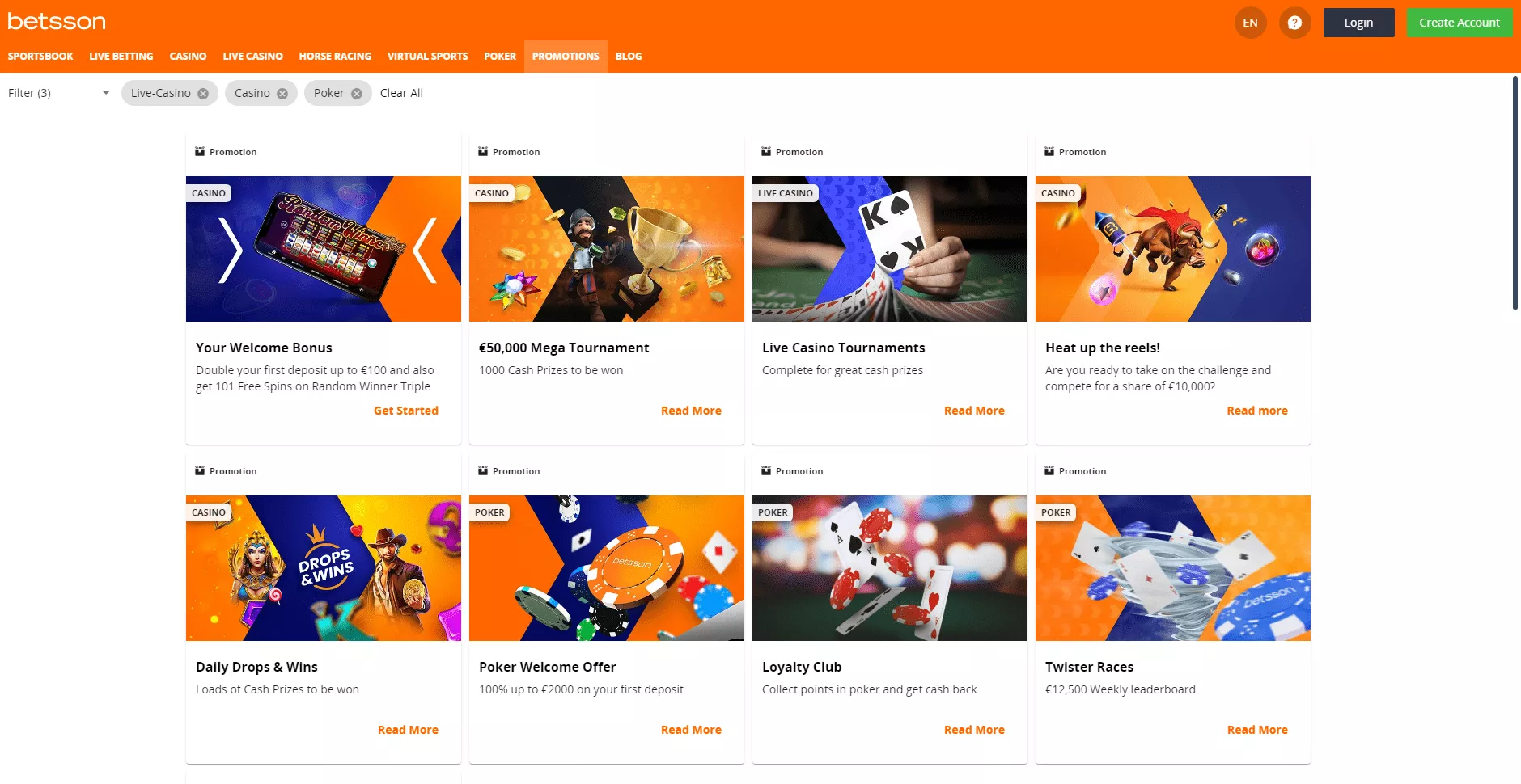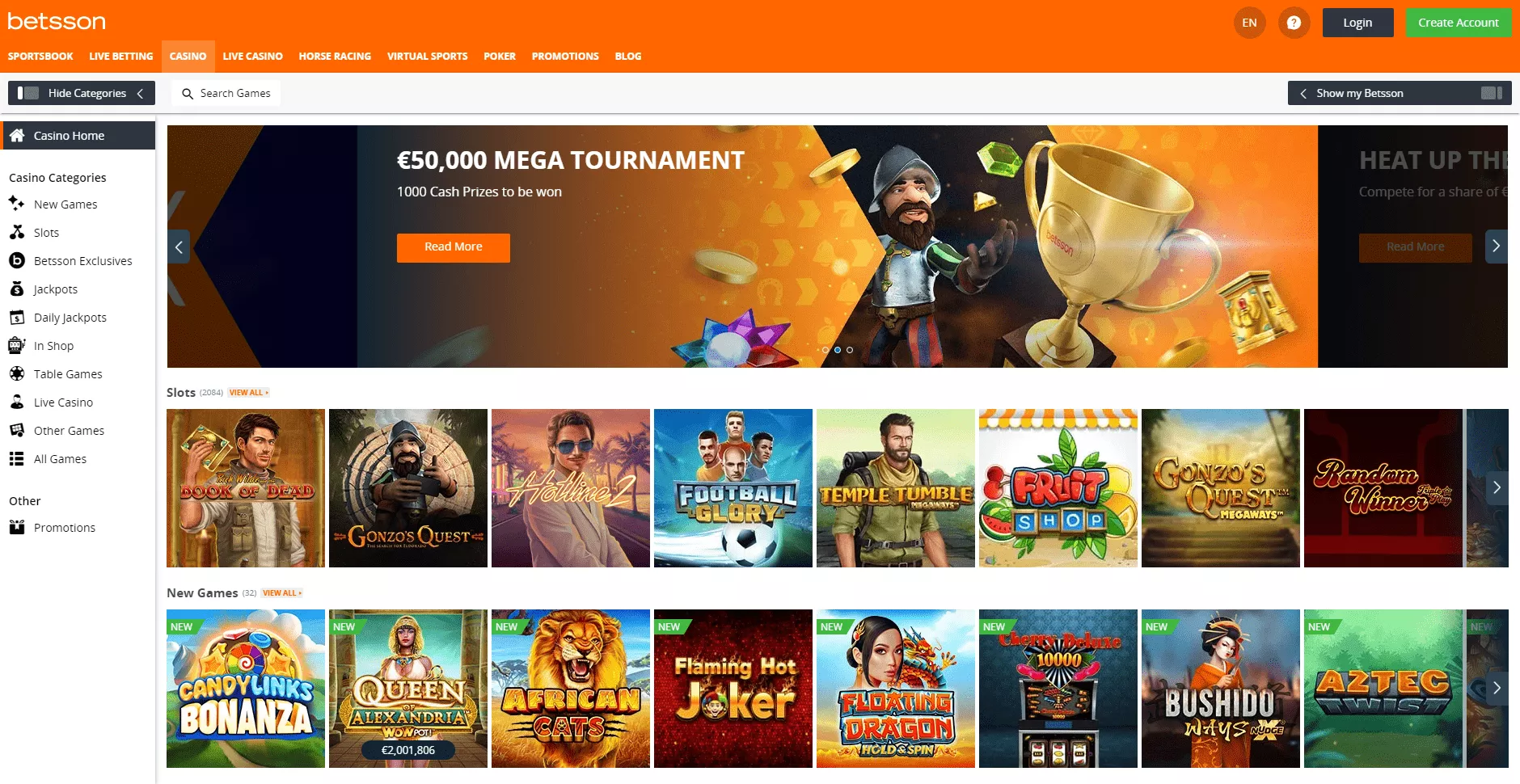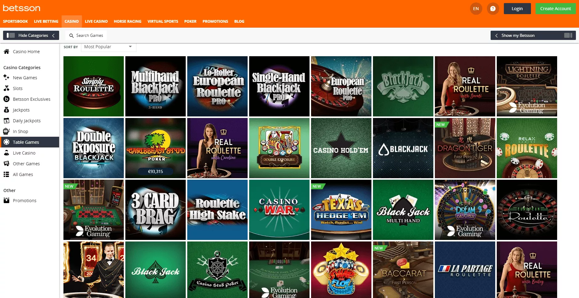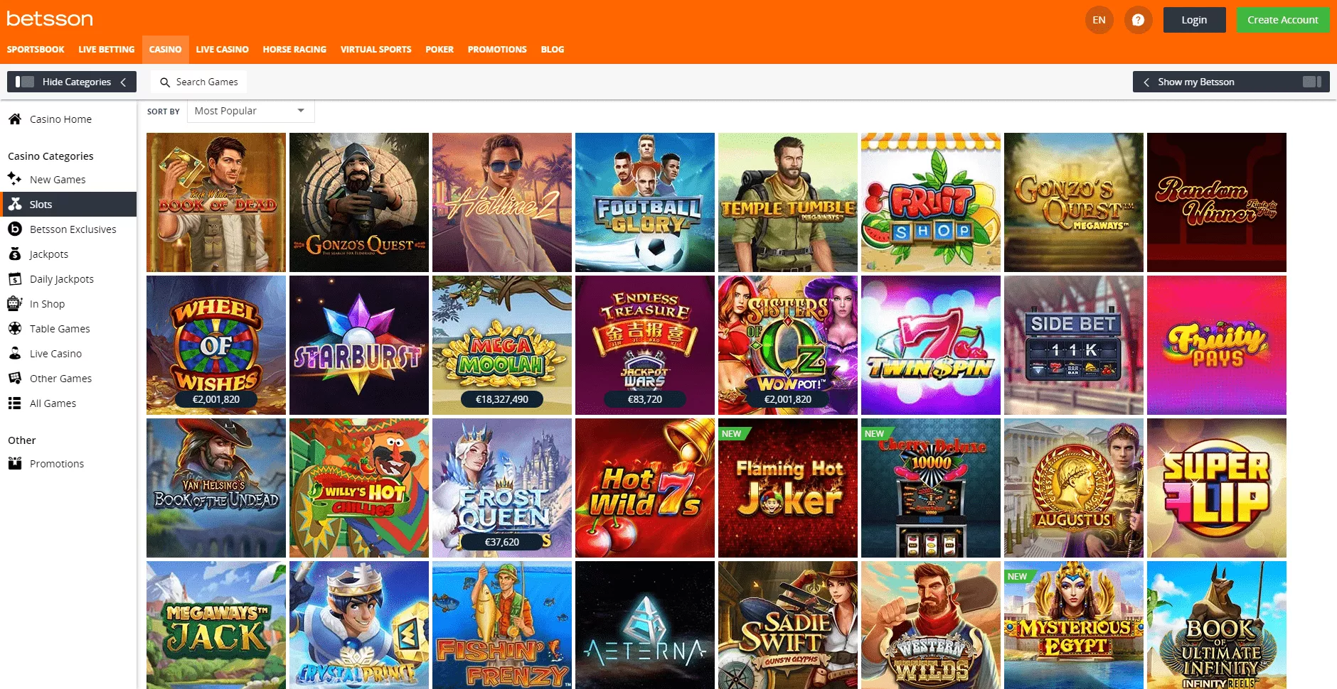 Operator umożliwia graczom dostęp do ponad 1300 tytułów gier od najlepszych deweloperów, stale aktualizując swoją ofertę o nowe tytuły. Cały katalog gier jest łatwy w nawigacji. Użytkownicy mogą wyszukać ulubione gry korzystając z menu i podkategorii takich jak: Wszystkie gry, Nowe gry, Sloty, Jackpoty, Ekskluzywne gry Betssona, Gry stołowe, Kasyno na żywo, Video poker, Codzienne jackpoty oraz Inne Gry. Ponadto wchodząc w każdą z kategorii, można sortować gry alfabetycznie lub od aktualnie najpopularniejszych tytułów.