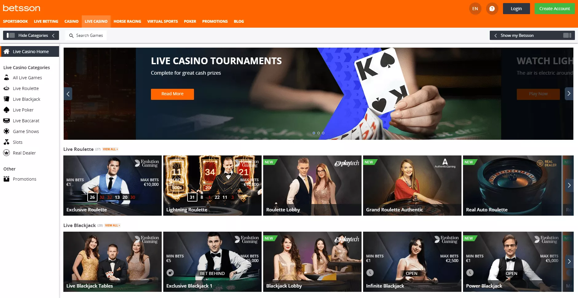 Rozbudowana oferta kasyna z krupierem na żywo zachęca graczy do uczestnictwa w rozgrywkach zarówno dobrze znanych gier kasynowych: ruletki, blackjacka, bakarata, Betsson poker, jak i tych rzadziej spotykanych w wersjach live: grze w kości czy zdrapkach.