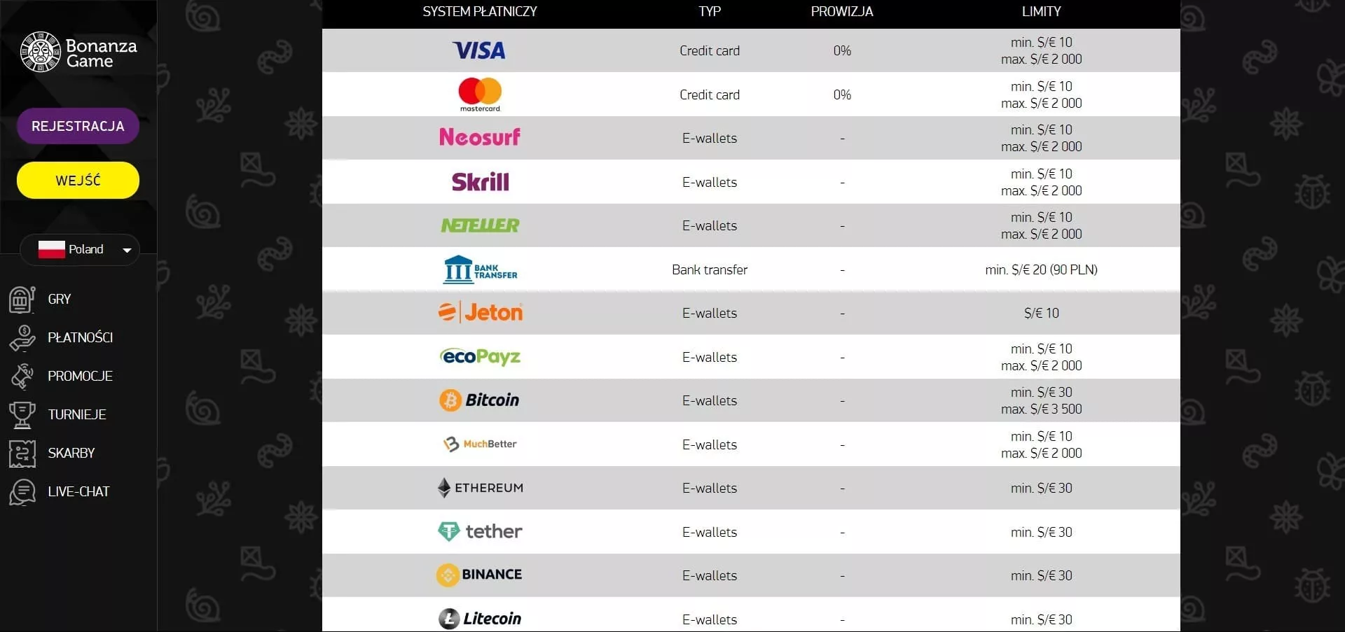 Jeśli chodzi o podział limitów wpłat i wypłat, dostępnych w Bonanza casino online, to wygląda on następująco: