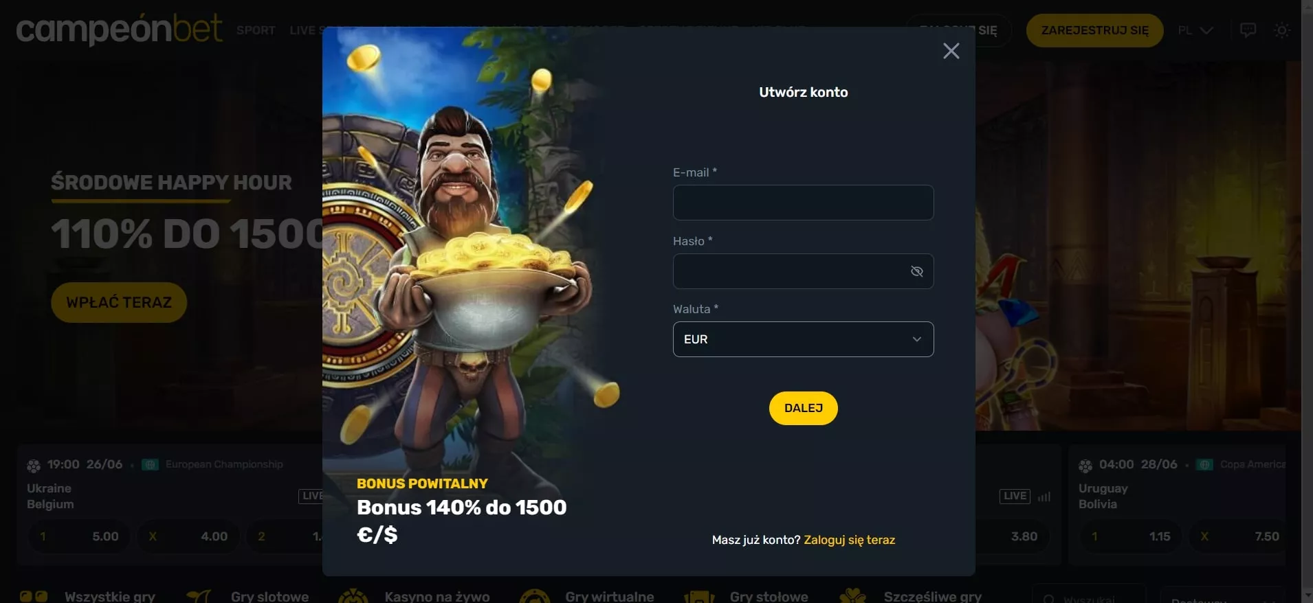 Należy kliknąć przycisk “Zaloguj się” znajdujący się w prawym górnym rogu strony głównej kasyna. Następnie wystarczy wprowadzić adres e-mail oraz hasło podane podczas rejestracji i potwierdzić logowanie.