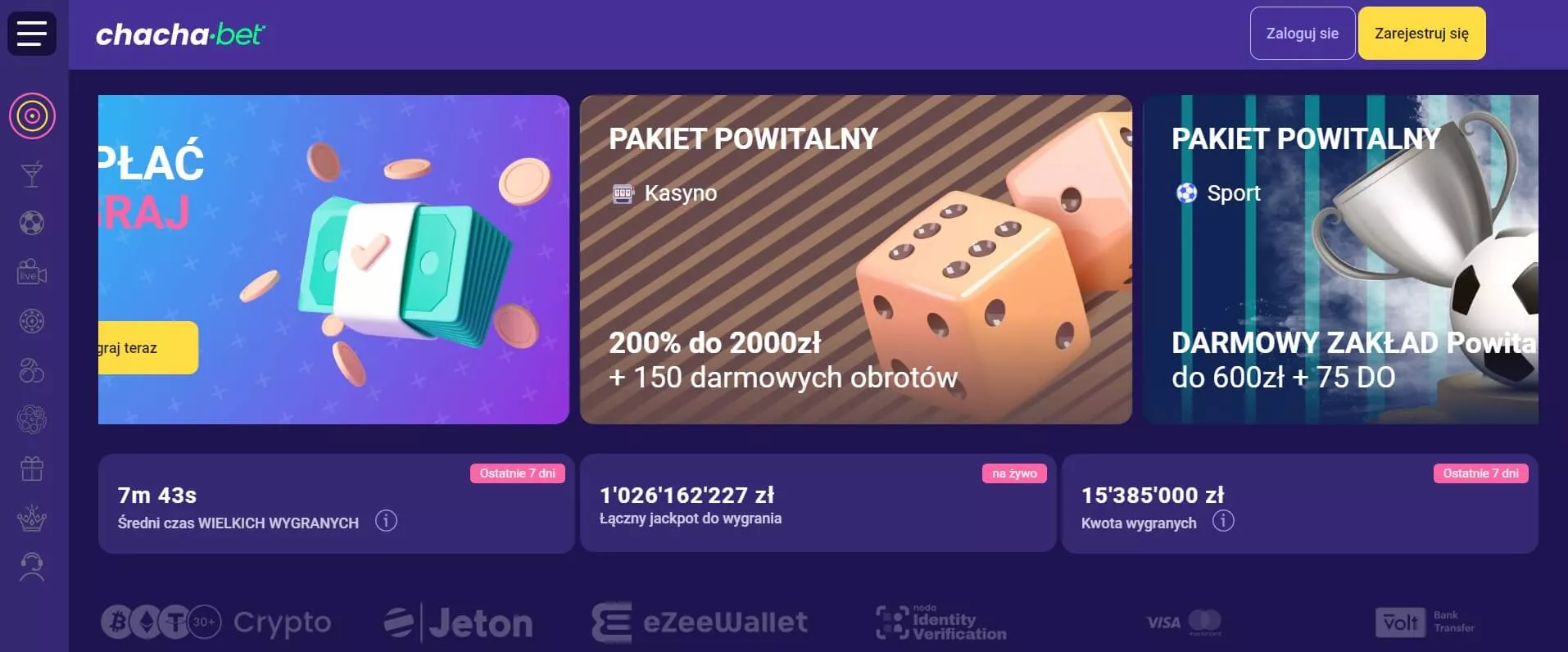Ogólnie rzecz ujmując, w przypadku ChachaBet warto podkreślić obecność ekskluzywnych promocji dla graczy mobilnych. Oprócz tego polecam gry Crash dla szybkich wygranych z mnożników. Serwis wspiera kryptowaluty, co czyni je świetną opcją dla natychmiastowych wpłat i wypłat. Główną wadą kasyna jest brak rozbudowanego zakresu opcji płatniczych, co oznacza brak wsparcia dla Blika, kart przedpłaconych oraz większości e-portfeli. Znajdziemy tu tylko krypto, MiFinity oraz karty płatnicze.