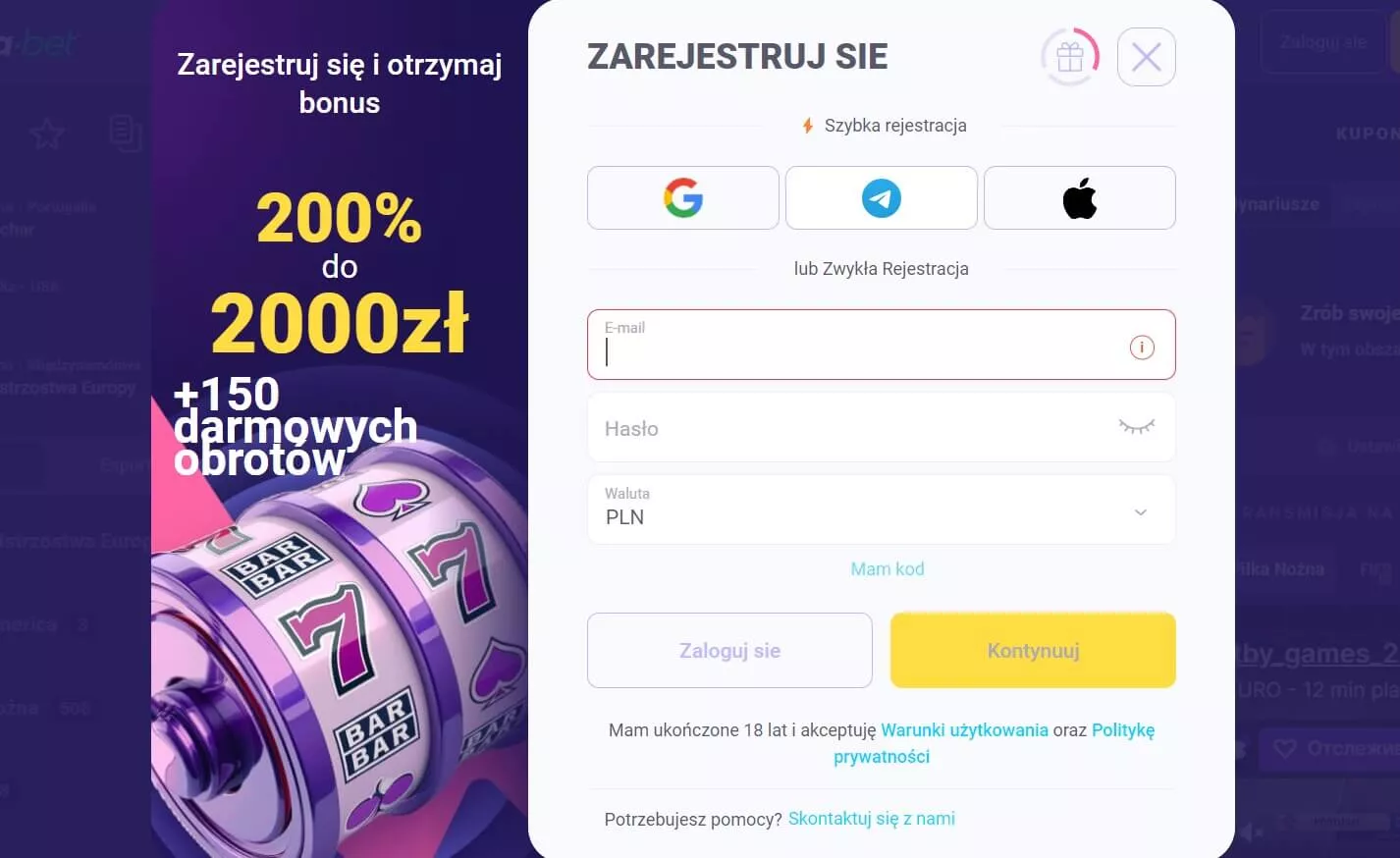 Wybierz ofertę promocyjną podczas rejestracji lub zaznacz pole „Nie chcę wybierać bonusu”. W drugim przypadku będziesz mógł wybrać ofertę po rejestracji.