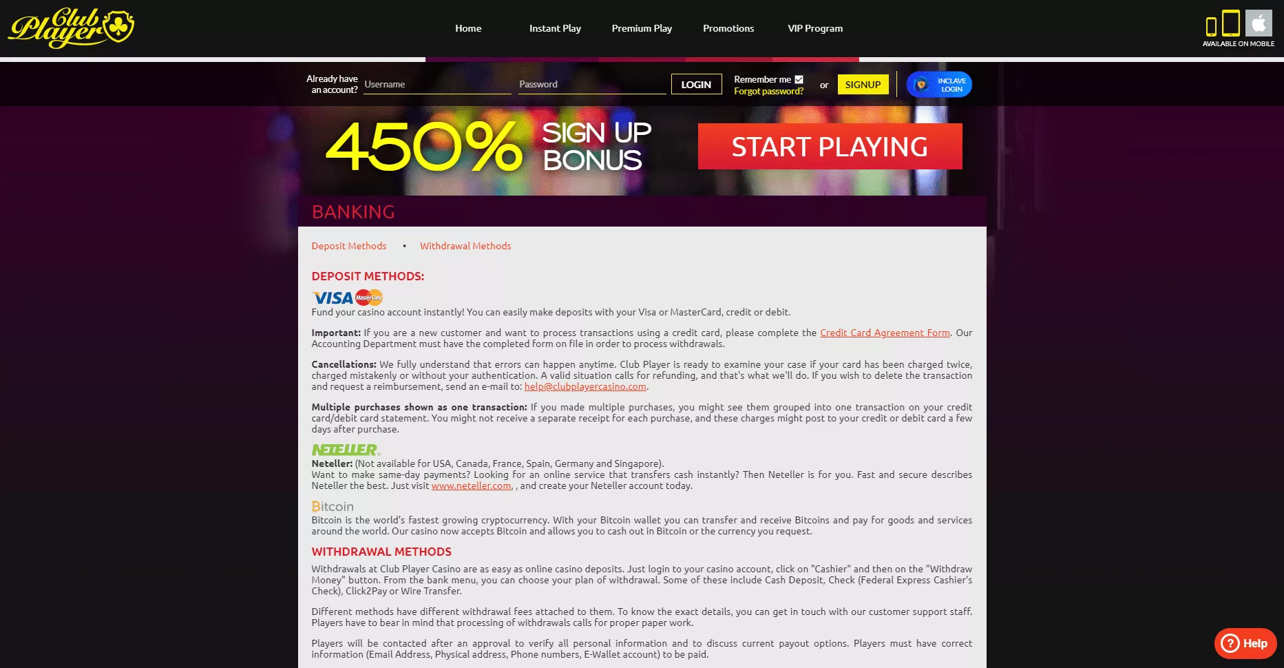Kiedy potrzebujesz pomocy, kasyno Club Player ma zespół specjalistów od pomocy technicznej, aby uzyskać odpowiedzi, których potrzebujesz na czas. Aby uzyskać jak naj szybką reakcję, zalecamy korzystanie z usługi czatu na żywo przez 24 godziny na dobę, 7 dni w tygodniu. Możesz również zadzwonić do nich przez bezpłatny numer amerykański lub wysłać e-mail i oczekiwać odpowiedzi w ciągu 24 godzin.