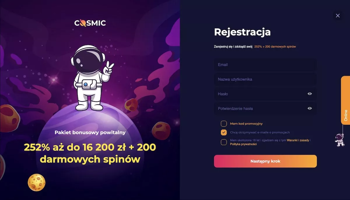 Aby zarejestrować się w kasynie CosmicSlot, przejdź na stronę rejestracji i wypełnij formularz rejestracyjny. Podaj swoje dane osobowe, adres e-mail, wybierz nazwę użytkownika i hasło, a następnie postępuj zgodnie z instrukcjami, aby ukończyć proces rejestracji.