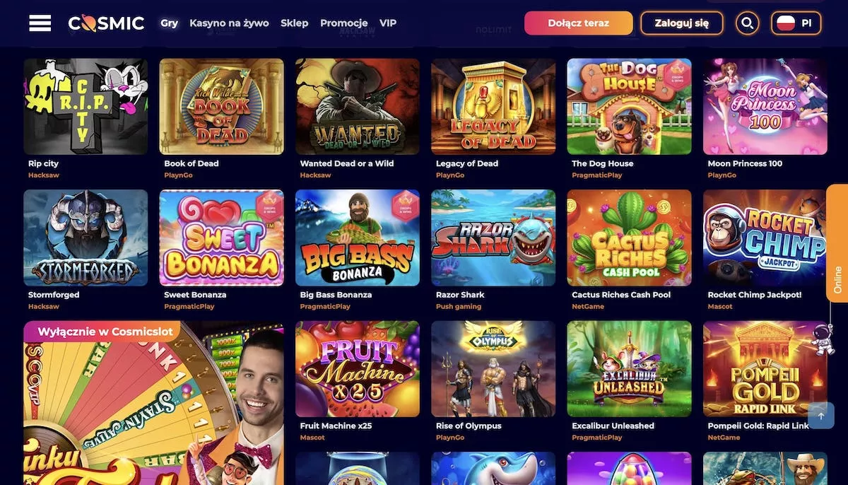 Kasyno CosmicSlot oferuje szeroki wybór gier kasynowych i automatów, które dostępne są dla polskich graczy. Możesz cieszyć się różnorodnością rozrywki, obejmującą takie kategorie jak automaty, gry stołowe, gry na żywo i wiele więcej.