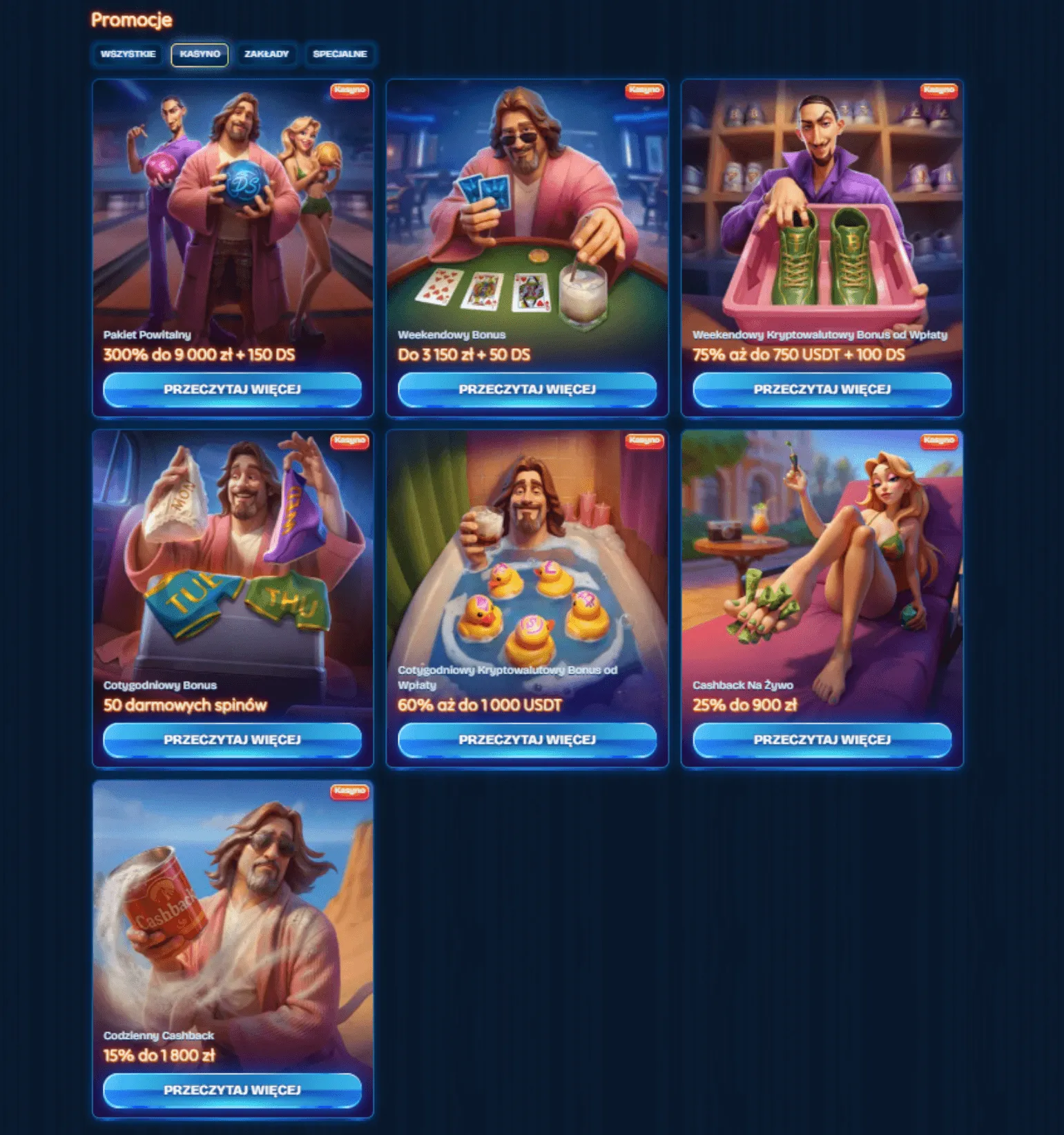 Dudespin to międzynarodowe kasyno online, które jest przeznaczone dla graczy z Polski. Strona kasyna proponuje siedem bonusów. Po rejestracji nowi gracze mogą oczekiwać pakietu powitalnego o wartości do 300% i 9000 zł oraz 150 spinów. Oferowany jest także pięcioetapowy program VIP.