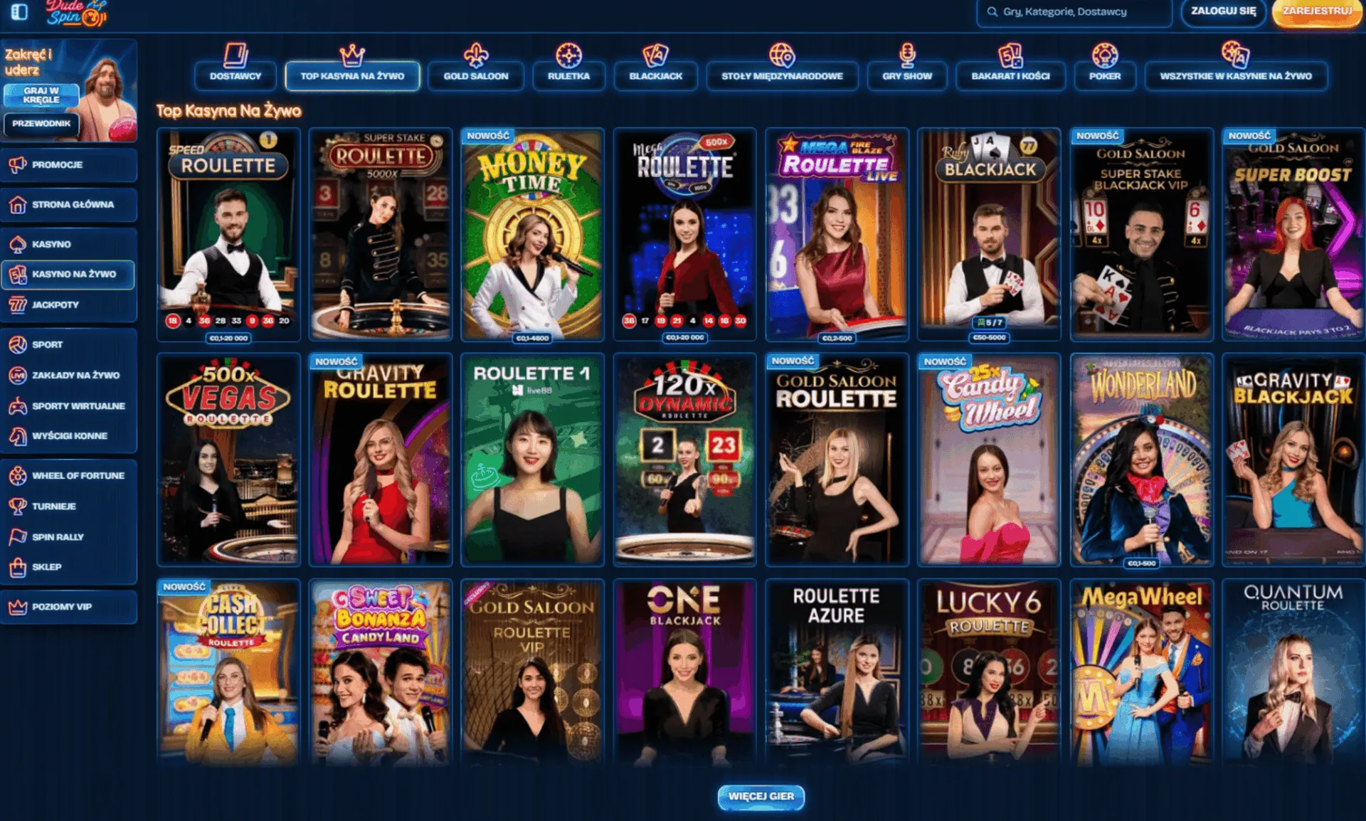 Polscy gracze mają dostęp do różnorodnego wyboru gier stołowych. Katalog obejmuje klasyczne tytuły od uznanych producentów, takich jak Evolution Gaming, Pragmatic Play Live i Ezugi.