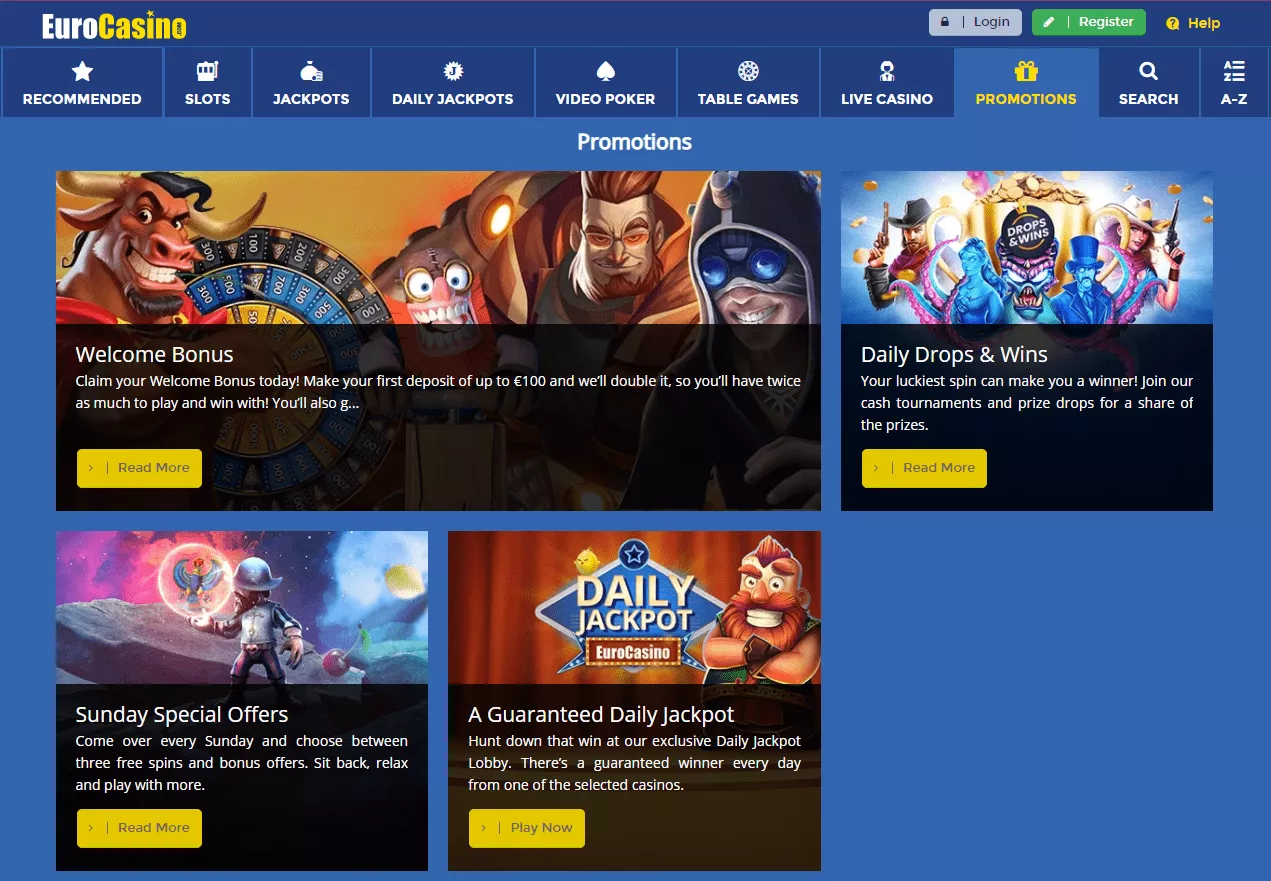 Casino Euro oferuje szeroką gamę bonusów i promocji – od znakomitego bonusu powitalnego CasinoEuro bez depozytu po wspaniałe oferty tygodniowe, CasinoEuro oficjalna strona oferuje wszystko, o czym może marzyć gracz. Główny CasinoEuro bonus powitalny jest oferowany wszystkim nowym graczom i jest dostarczany w formie 100% bonusu od depozytu do 1000 $. Dodatkowo otrzymasz również 100 darmowych spinów do wykorzystania na automacie Starburst firmy NetEnt. CasinoEuro opinie o bonusach są świetne.
