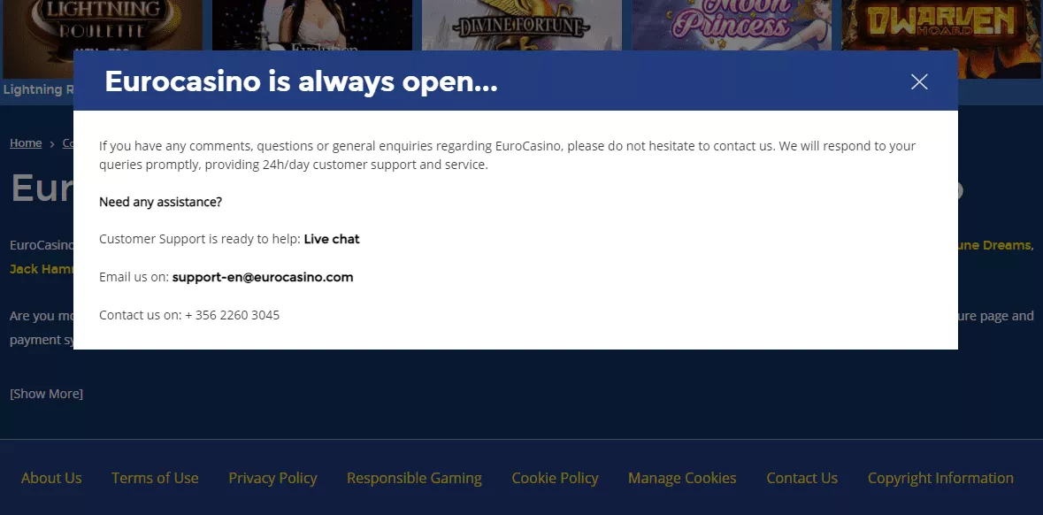 Casino Euro ma świetny dział wsparcia klienta czynny 24/7. Do dyspozycji czat na żywo, oraz CasinoEuro kontakt za pośrednictwem poczty e-mail. Czat może być niedostępny dla graczy z niektórych krajów.