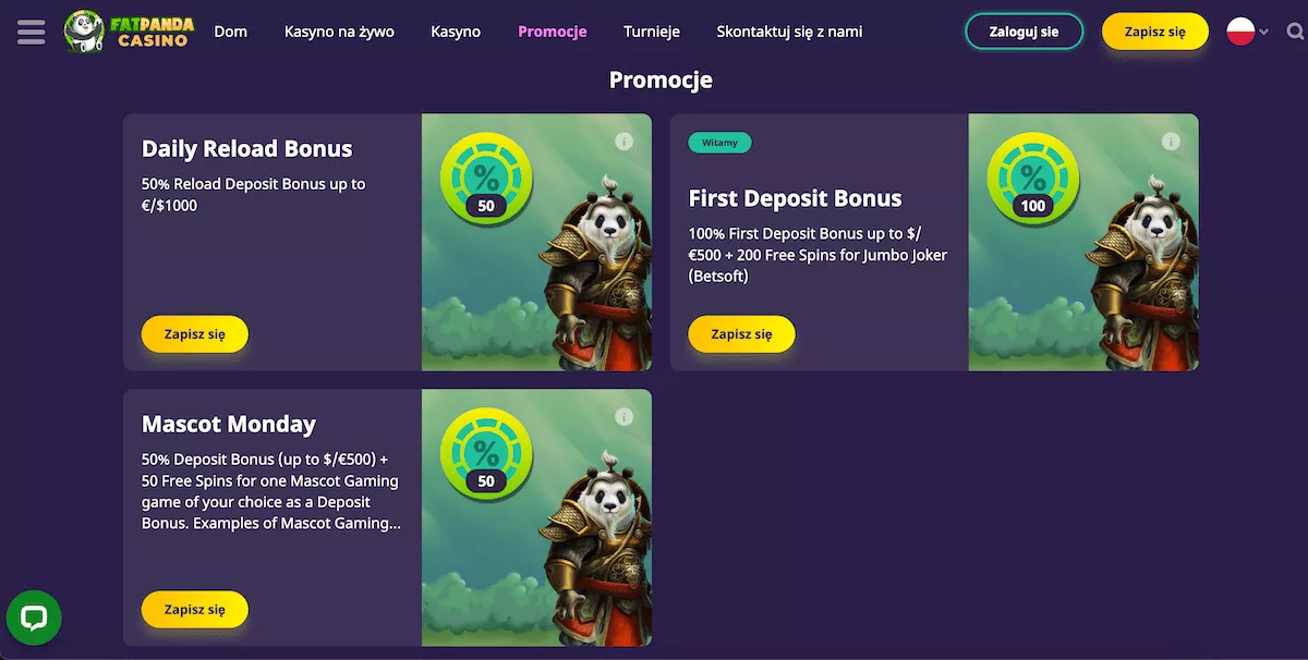 Jako ktoś, kto odwiedził wiele kasyn online, mogę powiedzieć, że FatPanda Casino oferuje solidny bonus powitalny, który warto sprawdzić. Jeśli dopiero zaczynasz, użyj linku polecającego Dobramine, aby podwoić swój pierwszy depozyt ze 100% match bonus i zdobądź aż do 200 darmowych spinów. Dodatkowo ciesz się codziennymi sekretnymi bonusami, które dodają jeszcze więcej zabawy.