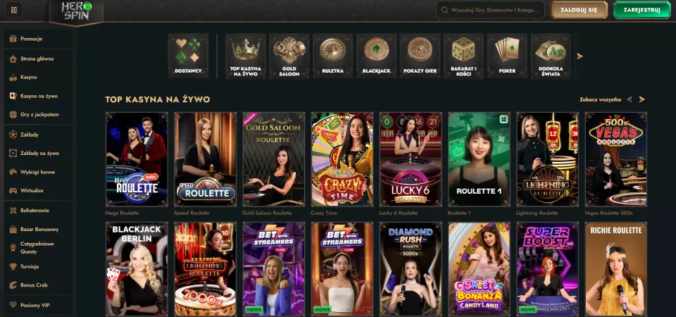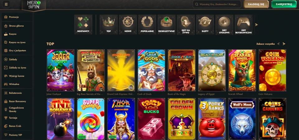Kasyno wirtualne Herospin może pochwalić się imponującą biblioteką ponad 5000 gier, pochodzących od 114 renomowanych dostawców oprogramowania. Dzięki temu gracze mogą cieszyć się różnorodnością rozgrywki oraz średnimi stawkami RTP na poziomie 96%, które są konkurencyjne na rynku. Herospin gry na prawdziwe pieniądze obejmują poniższe kategorie: