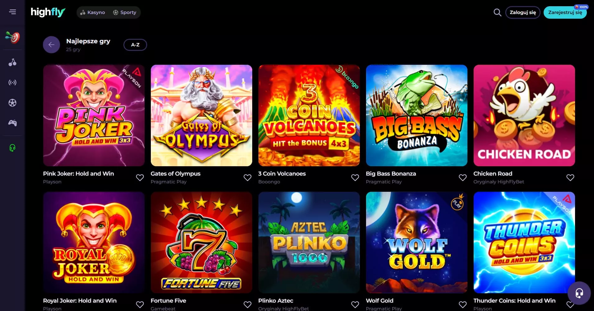 Kasyno wirtualne Highflybet posiada ponad 6000 gier od 80+ dostawców. Gracze mogą korzystać z wielu kategorii: sloty, gry na żywo, gry stołowe, wygrana błyskawiczna, jackpoty, klub bonus, zdrapki, oryginalne, Drops and Wins.