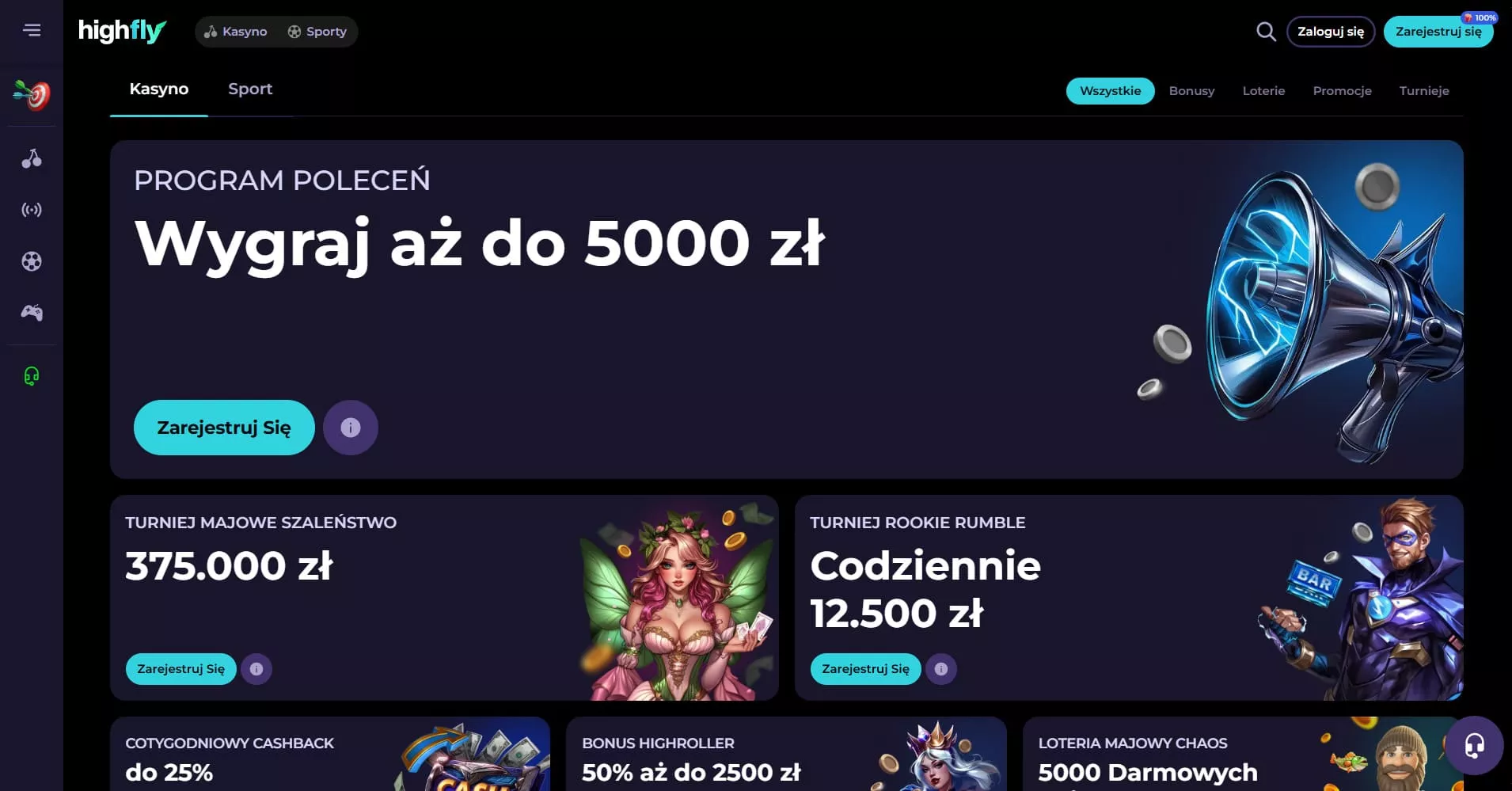 Oprócz wymienionych nagród w kasynie online dostępne są inne bonusy w kasynie Highflybet w 2026 roku, m.in. rozbudowana oferta turniejów – Spinoleague 2026 z nagrodami sięgającymi 48 000 000 PLN, turnieje na żywo z pulą 50 000 PLN i cotygodniowe wydarzenia z atrakcyjnymi pulami. Gracze mogą korzystać z Rakebacku do 17%, zakręcić kołem fortuny, awansować w 6-poziomowym klubie VIP, brać udział w loteriach, zdobywać nagrody kryptowalutowe i polecać znajomych przez program partnerski.