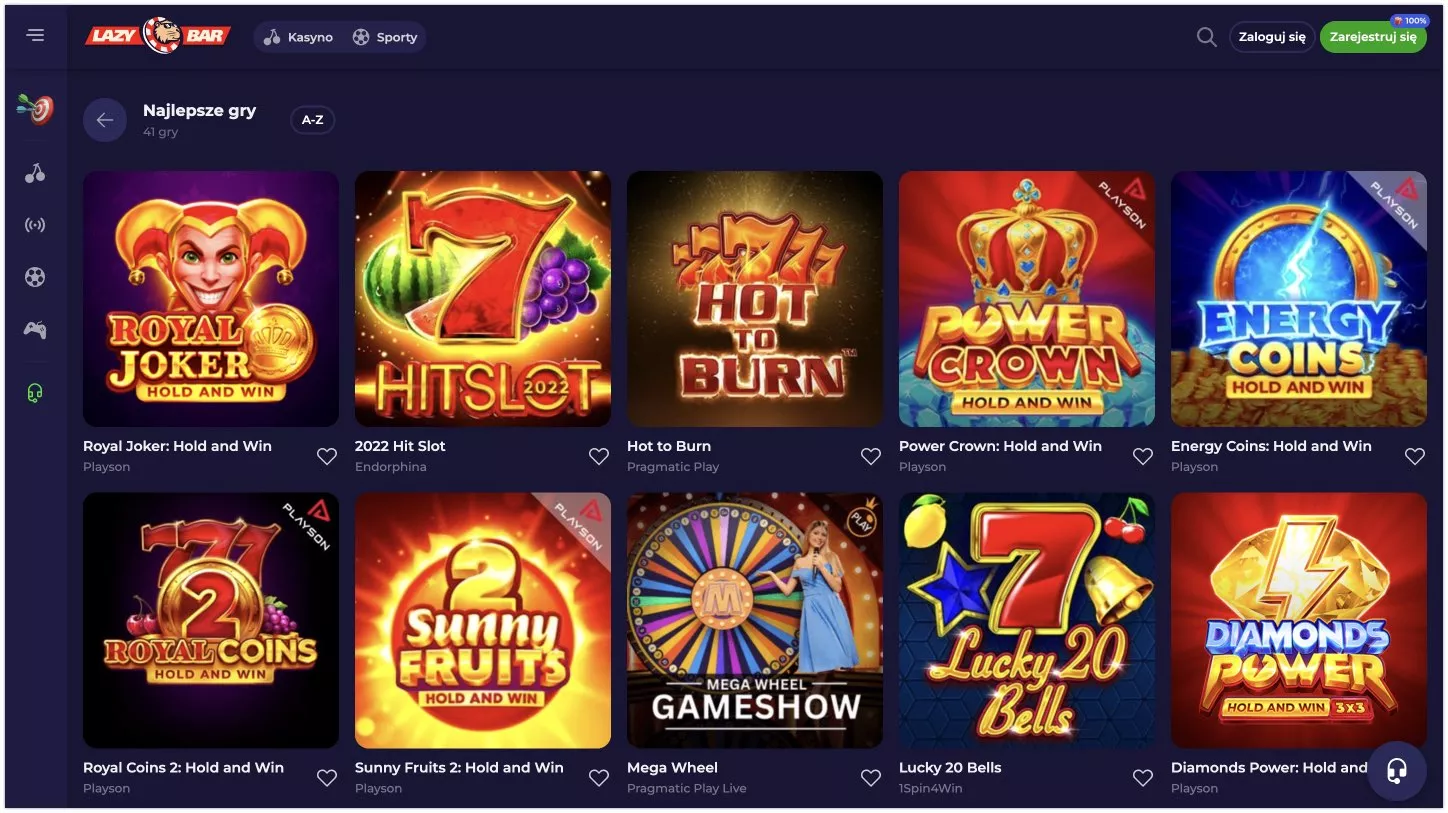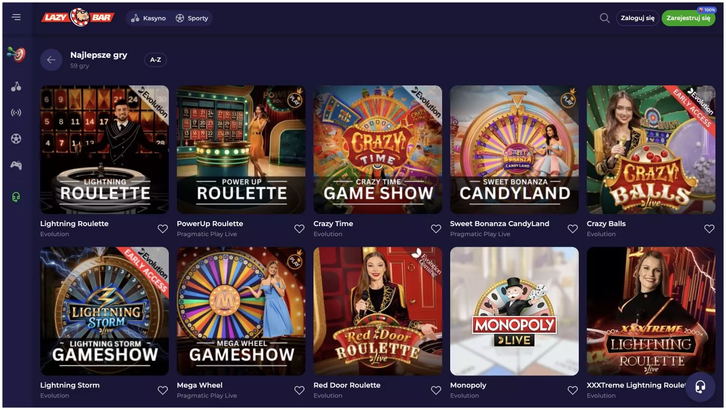 Lazybar posiada w swoim asortymencie ponad 6000 gier, w tym 500+ gier na żywo. Operator zapewnia średnie RTP na poziomie 96%. Dzięki współpracy z ponad 80 renomowanymi dostawcami gier na pieniądze Lazybar gwarantuje rozrywkę na najwyższym poziomie.