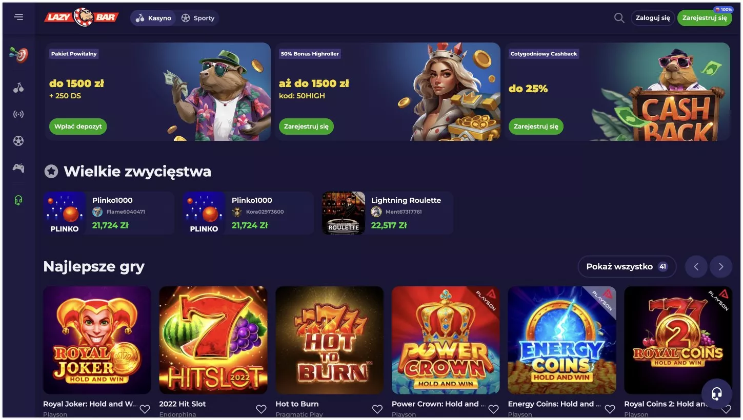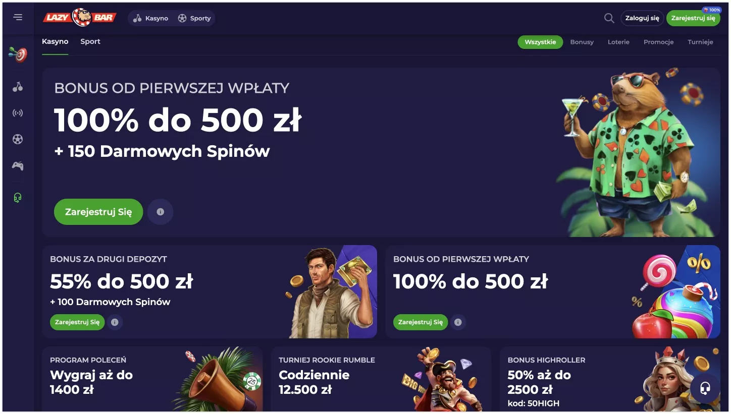 Lazybar, założone w 2024 roku, to nowoczesna platforma hazardowa, która wyróżnia się atrakcyjnymi bonusami i różnorodnością usług. Nowi gracze mogą skorzystać z bonusu powitalnego wynoszącego 100% do 500 PLN i 150 darmowych spinów. Strona dostępna jest w ponad 15 językach, co świadczy o jej międzynarodowym charakterze.