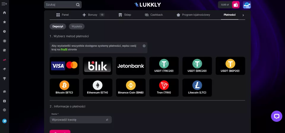 Internetowe kasyno Lukkly oferuje 11 metod wpłat oraz 8 metod wypłat, dostosowanych do potrzeb polskich graczy. Opcje płatności obejmują popularne rozwiązania, takie jak karty płatnicze, BLIK i kryptowaluty. Metody wpłaty w Lukkly i sposoby wypłaty wraz z limitami przedstawiamy poniżej.