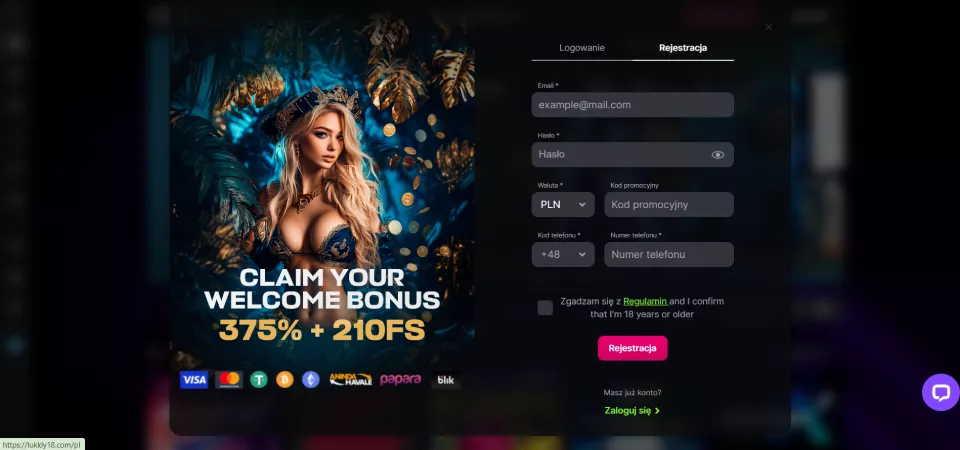 Aby zalogować się, wystarczy odwiedzić stronę kasyna i kliknąć przycisk Logowanie. Następnie wprowadź swój zarejestrowany adres e-mail oraz hasło. Jeśli nie masz jeszcze konta, należy przejść przez proces rejestracji, podając wymagane dane. Po zalogowaniu gracz otrzymuje pełny dostęp do gier, bonusów i metod płatności.