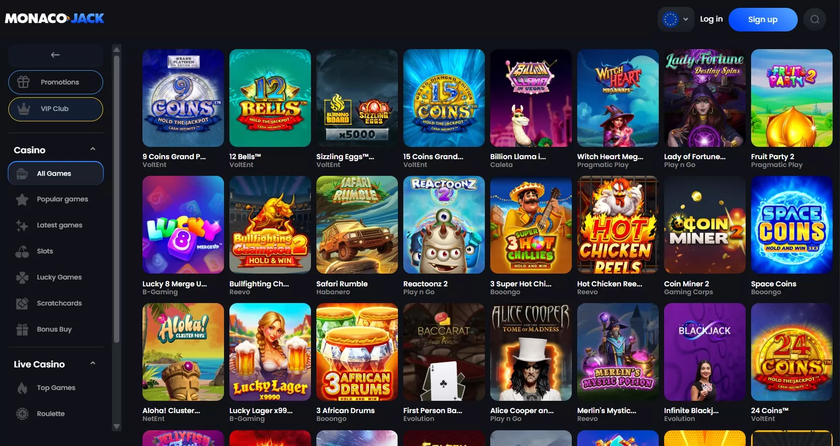 Lobby kasyna obejmuje ponad 3000 gier od 18 dostawców oprogramowania, w tym uznanych producentów automatów i twórców gier na żywo. Gry kasynowe MonacoJack są podzielone na kilka głównych kategorii: sloty, gry live, lucky games, zdrapki, bonus buy oraz gry stołowe.
