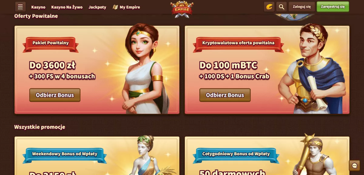 Aktualne bonusy w kasynie MyEmpire w 2026 obejmują pakiet powitalny dla nowych graczy z Polski, powitalny bonus na kryptowaluty, a także Program VIP i inne oferty dla stałych klientów. Każdą z tych promocji opiszemy w dalszej części recenzji.