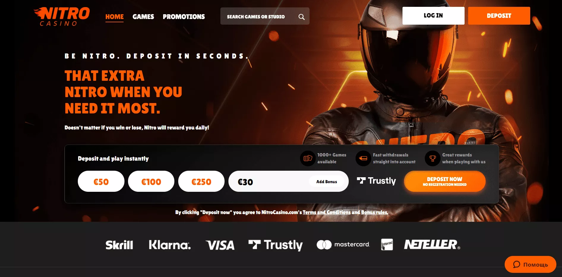 W zależności od języka, w jakim wyświetlamy stronę tego kasyna, naszym oczom ukażą się różne warunki promocji. W przypadku polskiej wersji strony wyświetla nam się informacja o konieczności wpisania kodu promocyjnego NITRO1.