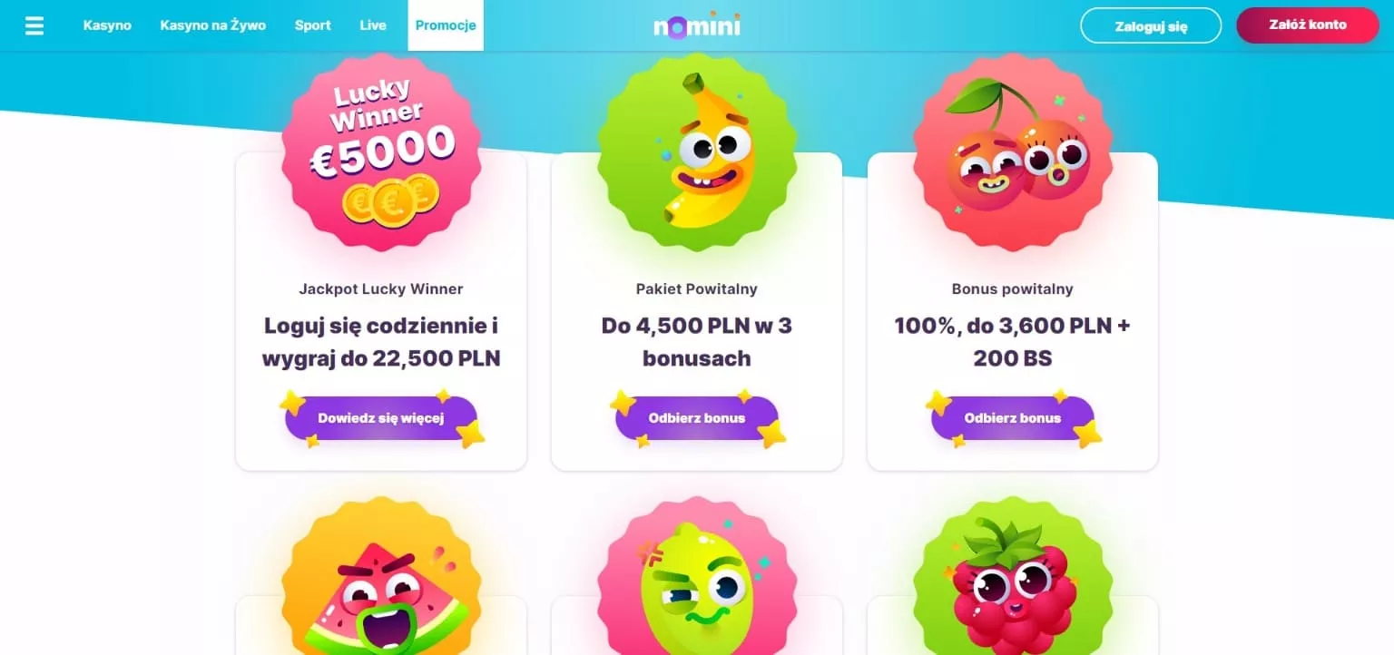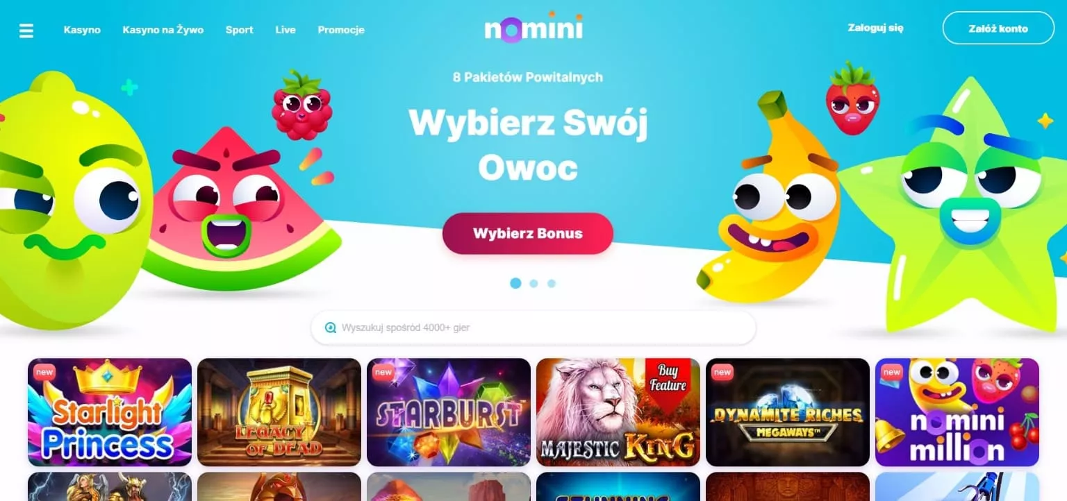 Obok tej witryny hazardowej z pewnością nie da się przejść obojętnie. Po tym, gdy wejdziesz na stronę główną, jaką przygotowało dla swoich graczy kasyno online Nomini, z pewnością zaskoczy Cię przyjazna dla oka kolorystyka, duża ilość kolorów oraz zabawne owocowe postacie, które są znakami rozpoznawalnymi, jakimi wyróżnia się ten Nomini Casino oficjalny portal. Innowacja i powiew świeżości, jakie niesie ze sobą to kasyno, zwraca uwagę coraz większej ilości graczy.