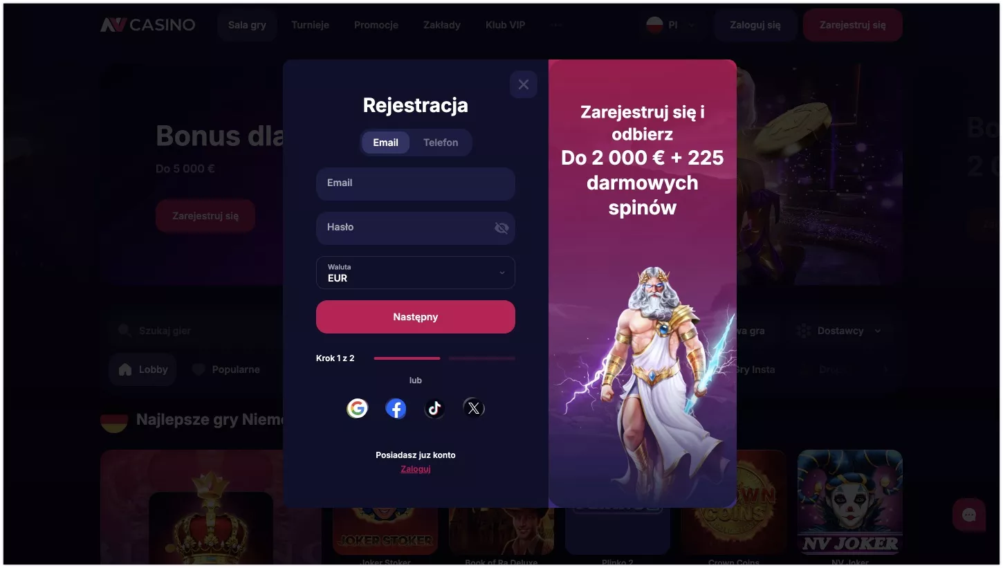 Przejdź do strony NV Casino. W prawym górnym rogu strony znajdziesz przycisk „Zaloguj”. Kliknij i zaloguj się podając swoje dane logowania: adres e-mail lub numer telefonu oraz hasło.