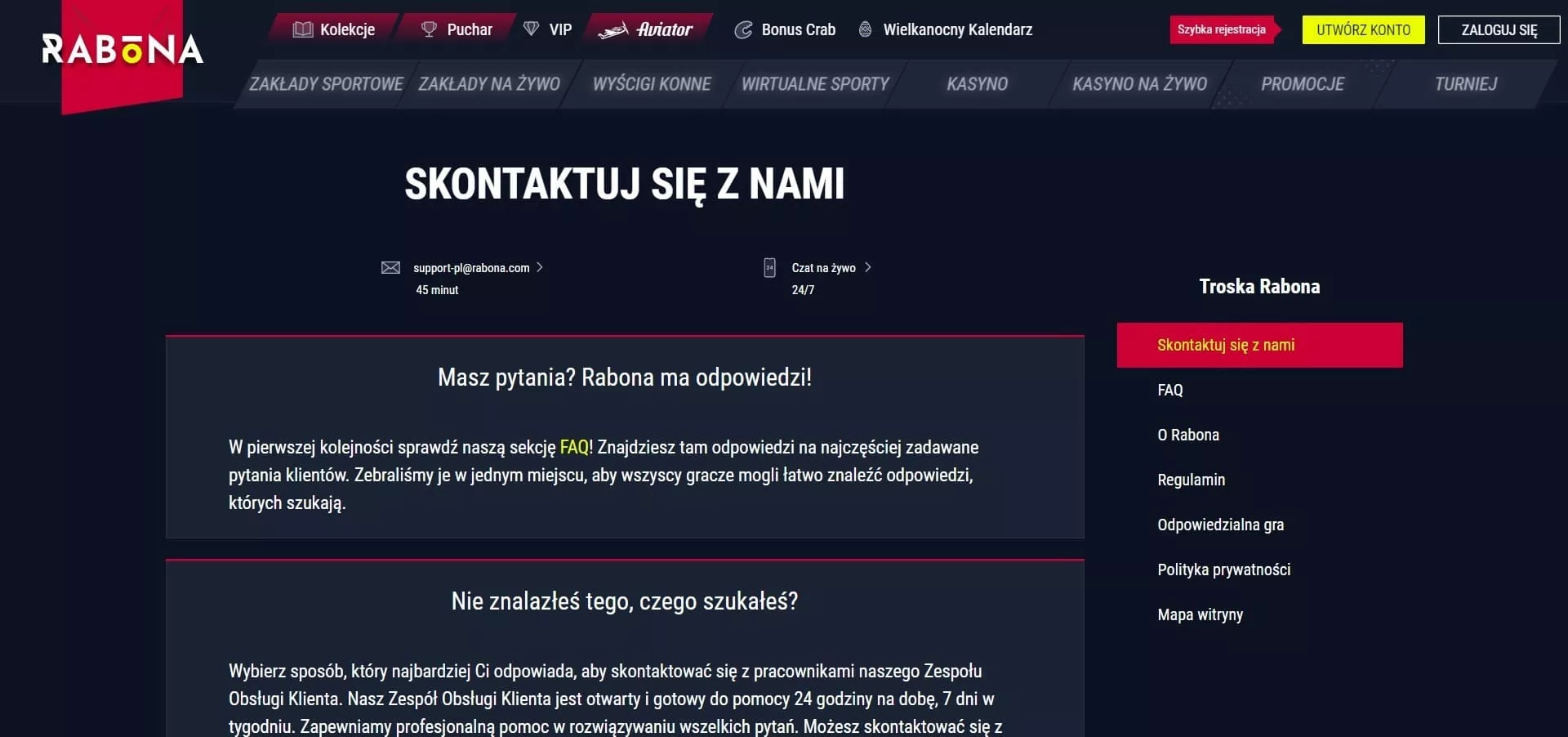 Dobra i fachowa obsługa klienta, to podstawa i priorytet każdego szanującego użytkowników kasyna internetowego. Nie inaczej jest w przypadku Rabona Casino online. Gracze mają do wyboru trzy kanały komunikacyjne do kontaktu. Pierwszym z nich jest wysyłanie zapytań i opisów problemów za pomocą e maili na adres: support-pl@rabona.com. Druga opcja, to kontakt z konsultantem za pomocą czatu na żywo, który jest dostępny dla użytkowników przez 24 godziny na dobę i przez 7 dni w tygodniu. Trzecim kanałem komunikacyjnym jest kontakt za pomocą numeru telefonu: +35627780669.