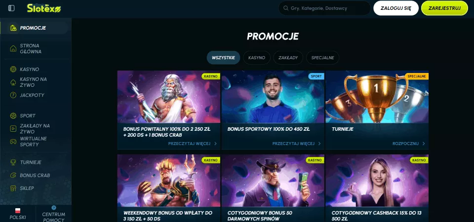Polski serwis zapewnia dostęp do rozbudowanej sekcji promocyjnej, która obejmuje nie tylko bonusy, ale też turnieje. Chcąc zdecydować się na Slotexo bonus kasynowy, gracze będą mieli do wyboru następujące opcje: