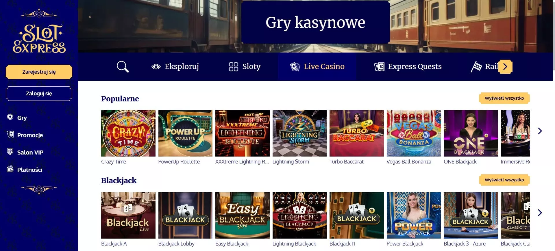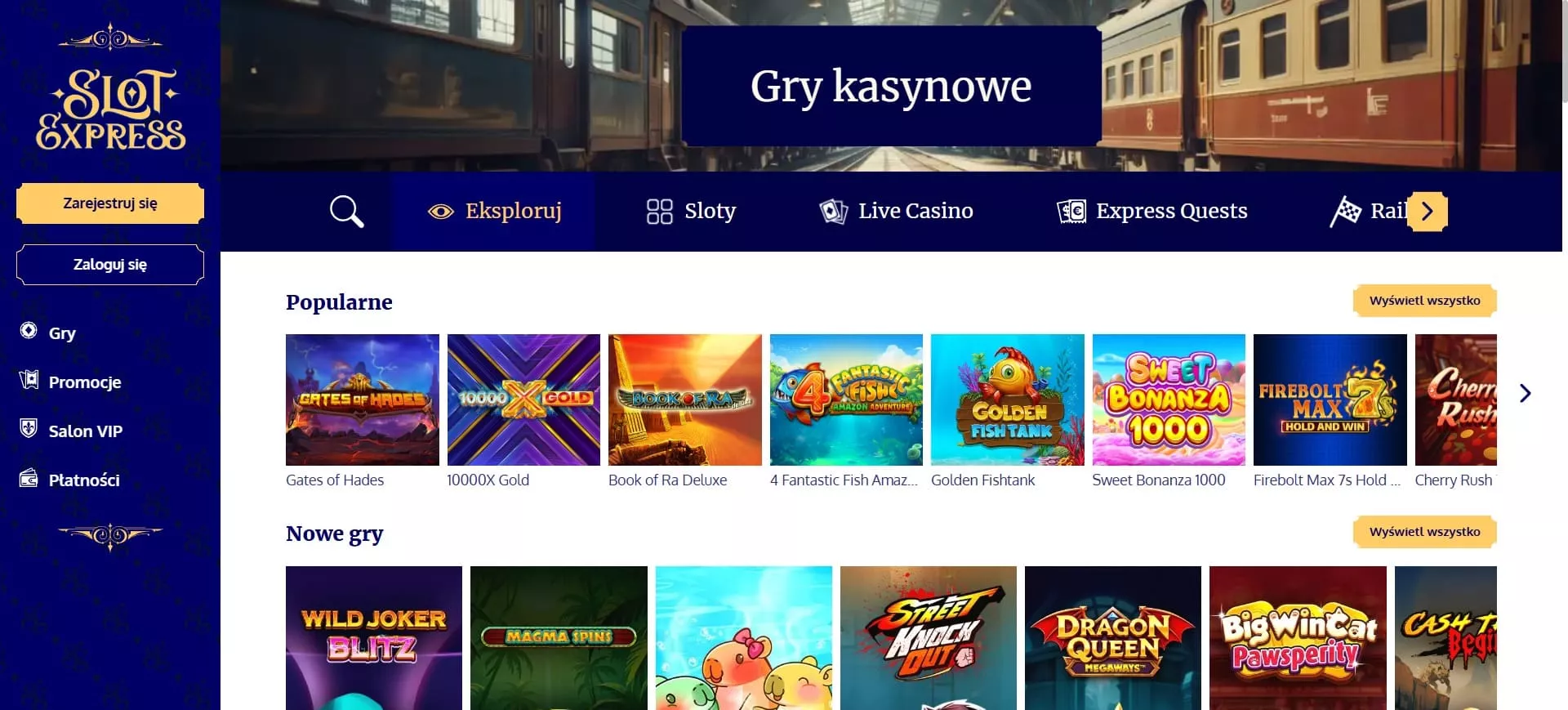 Kasyno posiada ponad 3500 gier od 40 dostawców, obejmujących wszystkie najważniejsze kategorie gier kasynowych. Gracze znajdą tu takie gry kasynowe SlotExpress: sloty, gry stołowe, kasyno na żywo, Express Quests, zakup bonusu, Drops & Wins, wysoka zmienność, megaways, natychmiastowa wygrana.