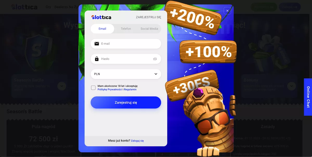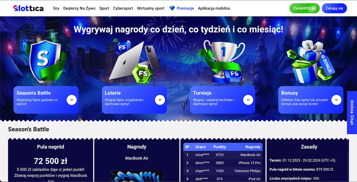 Turnieje: Zaloguj się do kasyna o dowolnej porze dnia i nocy, a zobaczysz trwający turniej w Slottica Casino PL. Aby wziąć udział w turnieju, musisz zalogować się na swoje konto i kliknąć „Graj”. Obstawiaj prawdziwe pieniądze na automatach lub grach stołowych i karcianych w turniejach, zbieraj punkty i osiągaj najwyższe miejsca w tabeli liderów turnieju, aby wygrać swoją nagrodę.