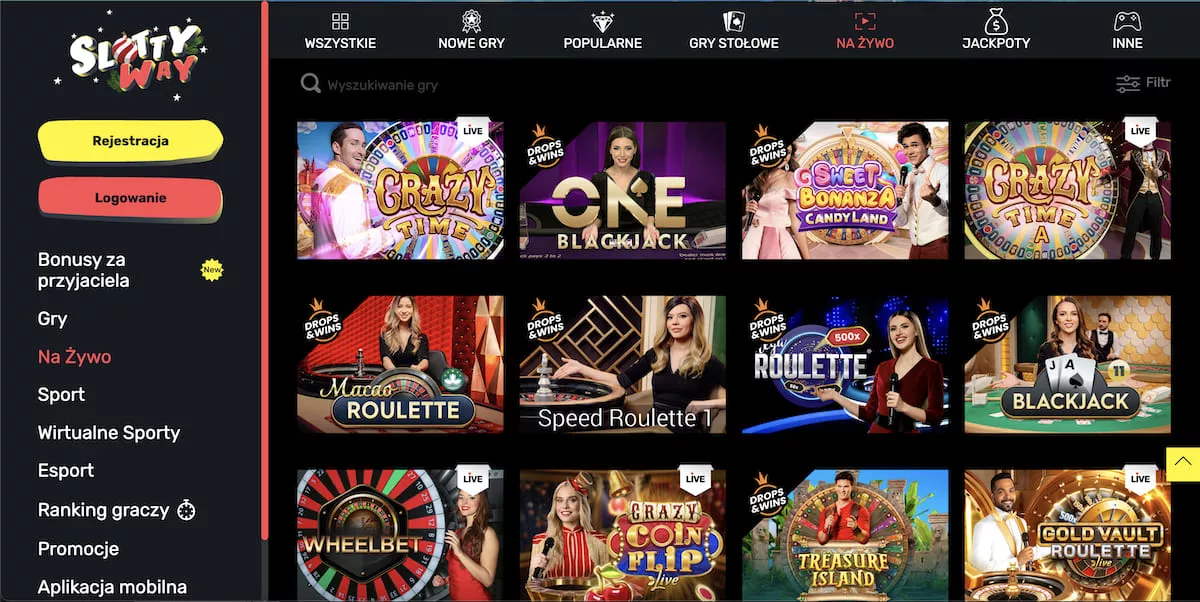 W kasynie SlottyWay znajdziecie przebogatą ofertę gier live od 22 dostawców – nasi recenzenci doliczyli się ich ponad 900. Dostęp do tych gier mamy z poziomu strony głównej, wystarczy kliknąć w zakładkę z napisem NA ŻYWO.