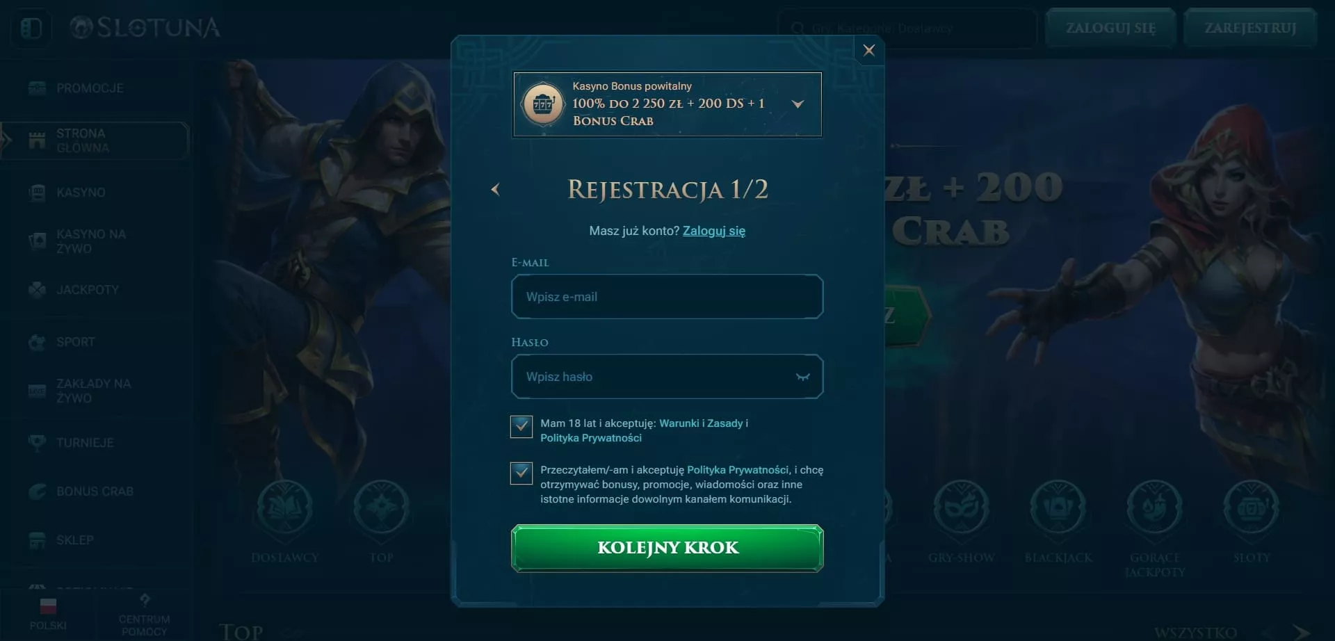 Aby zalogować się do kasyna Slotuna, odwiedź stronę główną kasyna i kliknij zielony przycisk Zaloguj się w prawym górnym rogu. Wprowadź swój zarejestrowany adres e-mail i hasło, a następnie kliknij Zaloguj się na dole formularza.