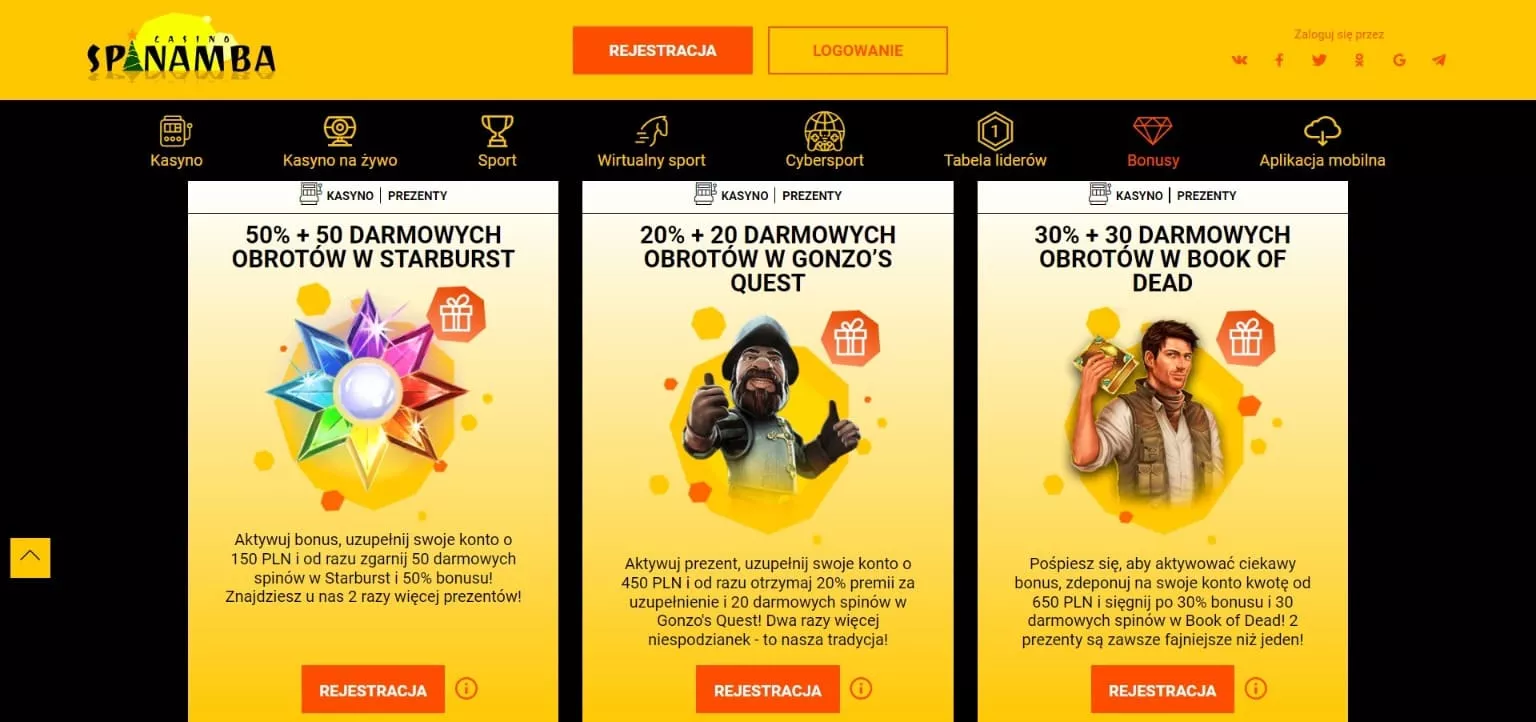 Oczywiście najlepsze bonusy w kasynie Spinamba 2026, są dostępne przede wszystkim dla nowych użytkowników. I tak w ramach bonusu powitalnego na start, gracze mogą otrzymać 200 darmowych obrotów za rejestrację konta użytkownika.