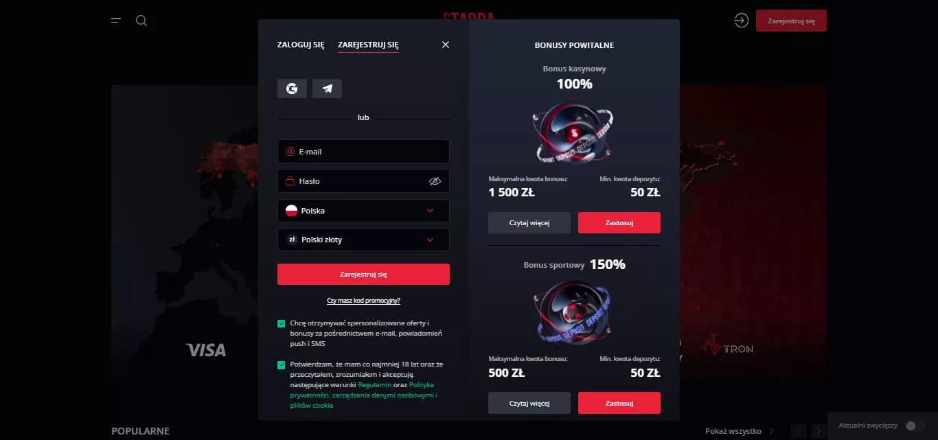 Proces rejestracji jest prosty i szybki. Jeśli chcesz, możesz natychmiast aktywować bonus powitalny podczas rejestracji jako ostatni krok formularza. Lub odblokować go później na swoim koncie za pośrednictwem sekcji promocyjnej.