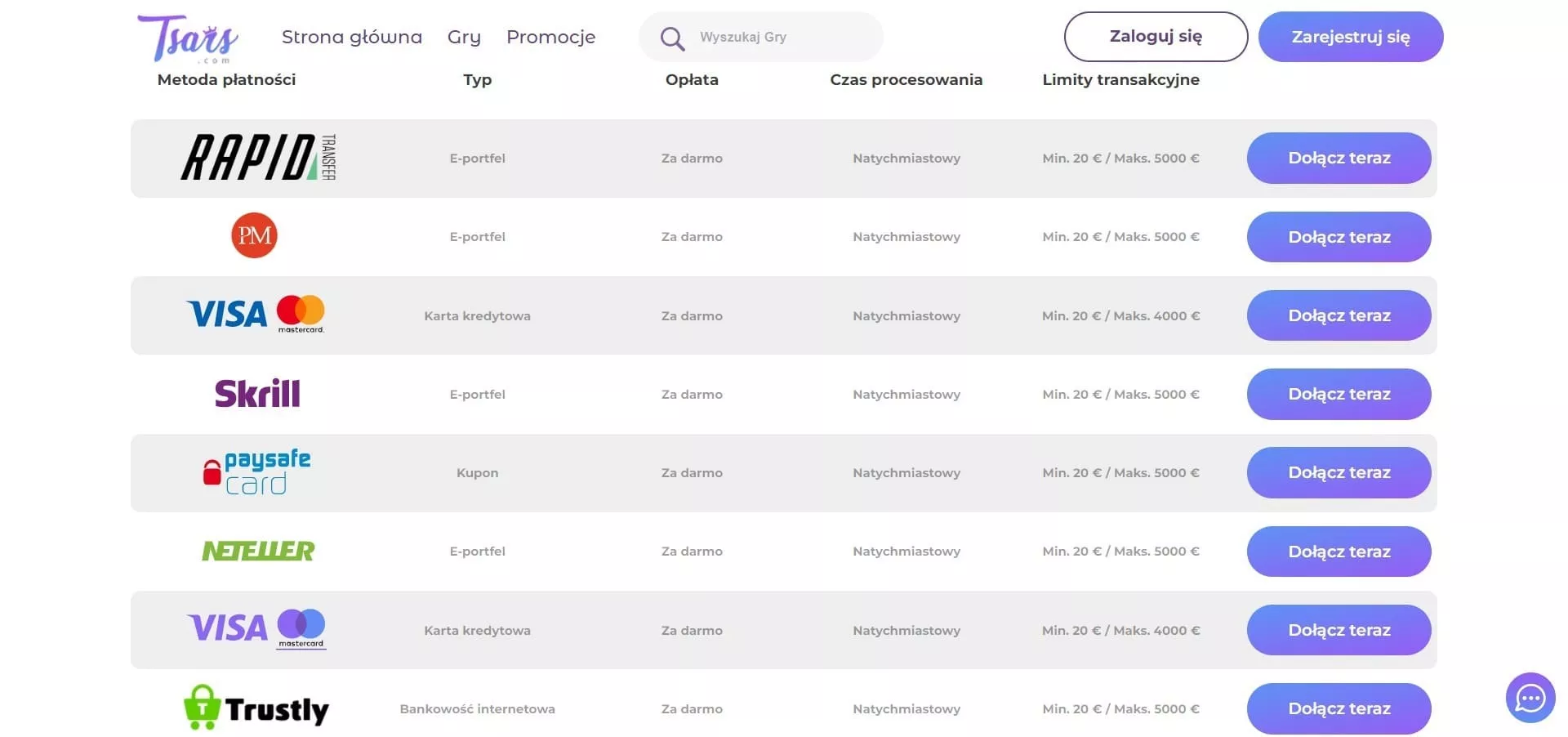 W Tsars kasyno internetowe dostępne są poniższe systemy płatności transakcji bankowych. I tak w przypadku wpłat depozytów, gracze do wyboru mają: