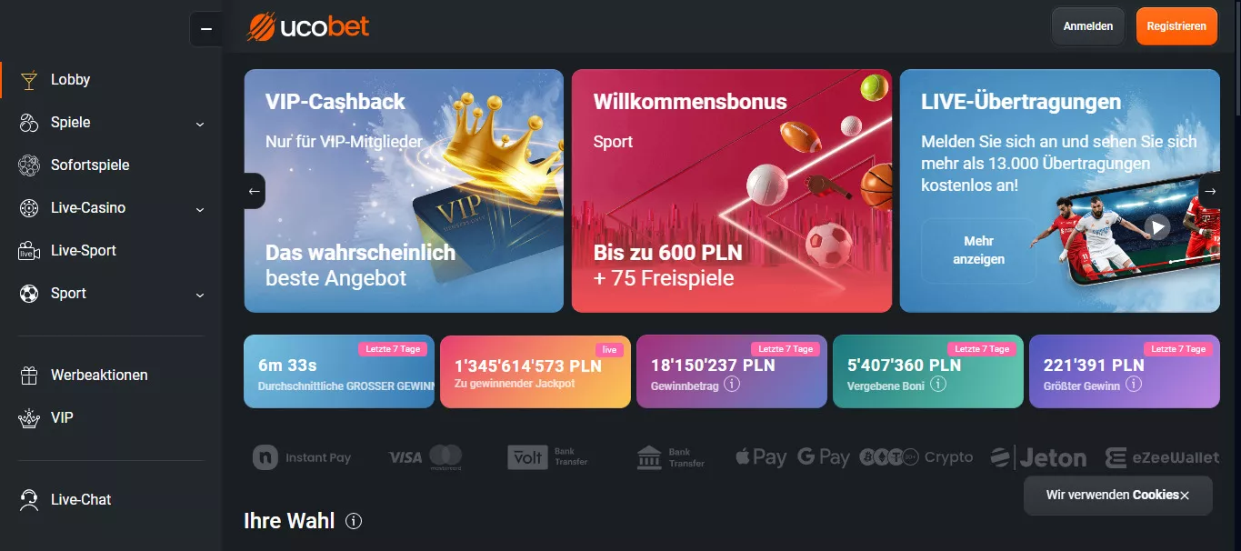 Oficjalna strona online kasyno UcoBet w Polsce 2026 przyjmuje depozyty wpłacane za pomocą kart kredytowych, kryptowalut (łącznie honorowanych jest tutaj 12 coinów) i popularne e-portfele Google Pay, eZeeWallet, Jeton. Istnieje też możliwość doładowania salda przez BLIK.
