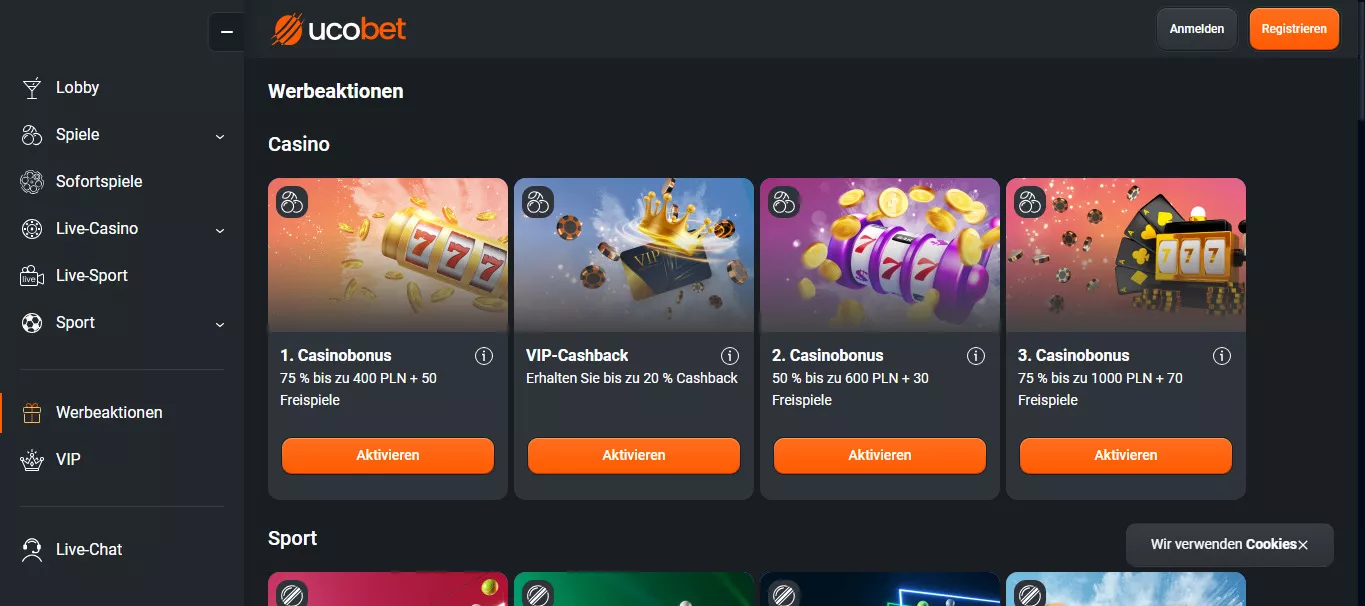 Nowe bonusy w kasynie UcoBet 2026 pojawiają się regularnie. Jeśli wiecie, jak zarejestrować się w kasynie online UcoBet, bez trudu odbierzecie już po chwili bonus powitalny – premiowane są tu pierwsze trzy depozyty łącznie na kwotę 1 000 EUR + freebety do wykorzystania u buka.