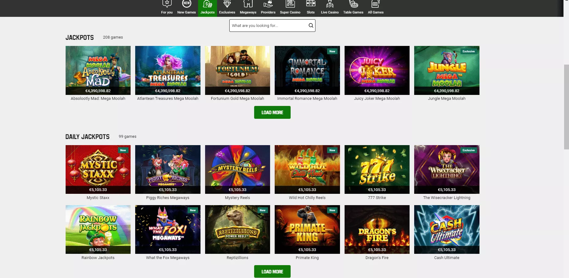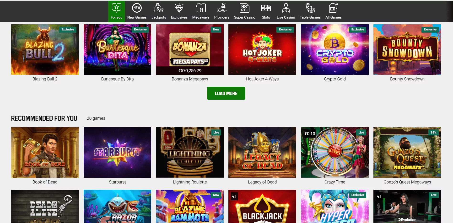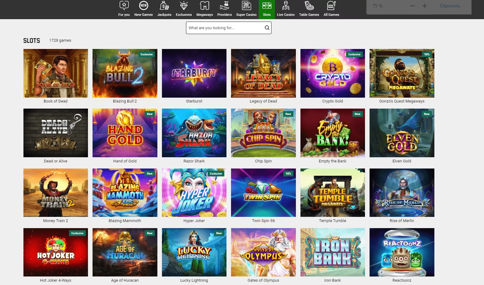 Wszystkie kategorie zostały umieszczone dla wygody gracza w górnym panelu: kasyno, kasyno na żywo, gry, bingo, poker. W każdej sekcji znajdują się różne rodzaje gier, które mają swoje podkategorie.