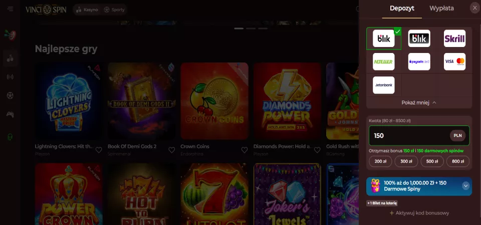 Minimalny depozyt wynosi 50 PLN, a minimalna wypłata wygranej wynosi 50 PLN. Aby wejść szybko do gry, dokonaj wpłaty w VinciSpin za pomocą szybkiego przelewu lub kryptowaluty.