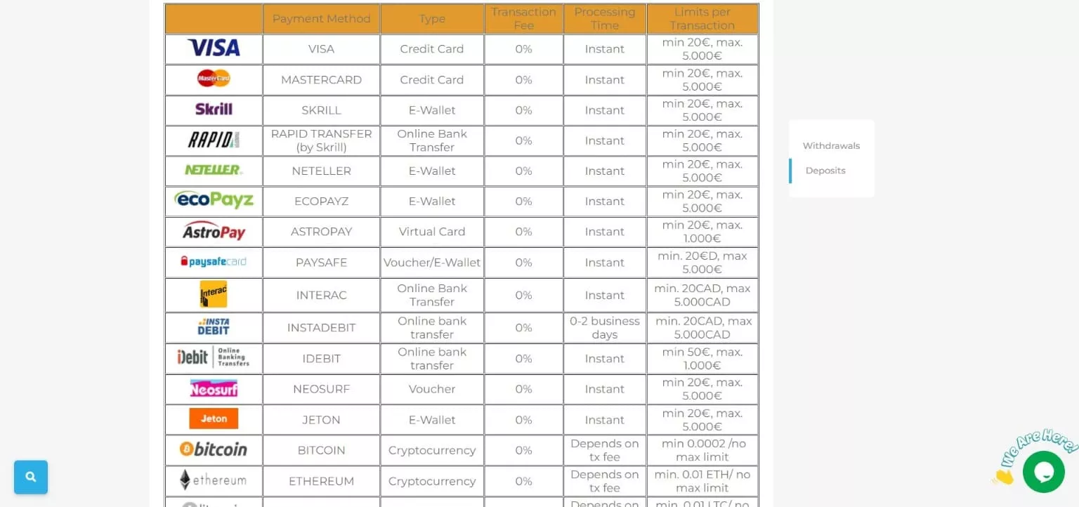 W Wolfy Casino gra na pieniądze staje się dostępna po opłaceniu pierwszego depozytu o wartości co najmniej 20€. Maksymalnie można wpłacić od 1000€ do 5000€ w zależności od wybranej opcji płatności. Podobne limity obejmują wypłaty, jednak w przypadku wybrania opcji płatności kryptowalutami, nie ma żadnych limitów na wpłaty i wypłaty, poza ewentualnie tymi, które ustali samo kasyno.