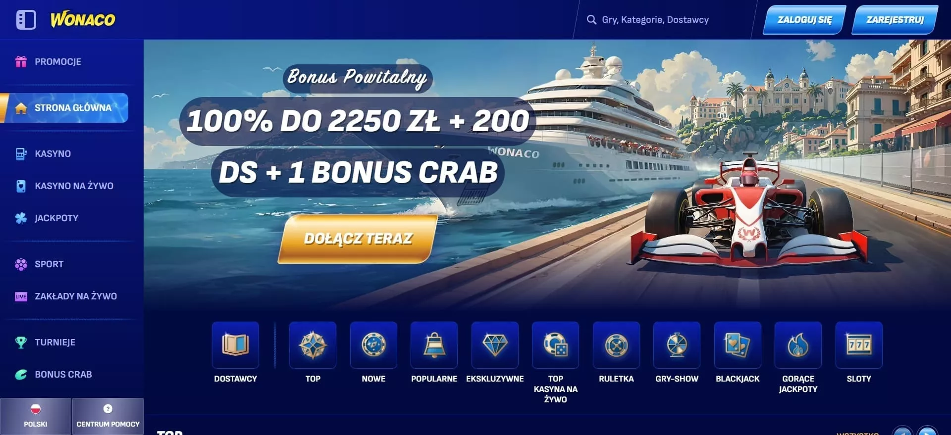 Wonaco posiada jasno wyodrębnione kategorie gier, w których możemy stawiać zakłady. W głównej sekcji znajdują się automaty wideo, zdrapki, bingo oraz gry typu crash – jest ich ponad 8 000. Odrębną zakładkę stanowi kasyno live. Operator w menu po lewej stronie umieścił również jackpoty. Nieco więcej kategorii jest w centralnym lobby.