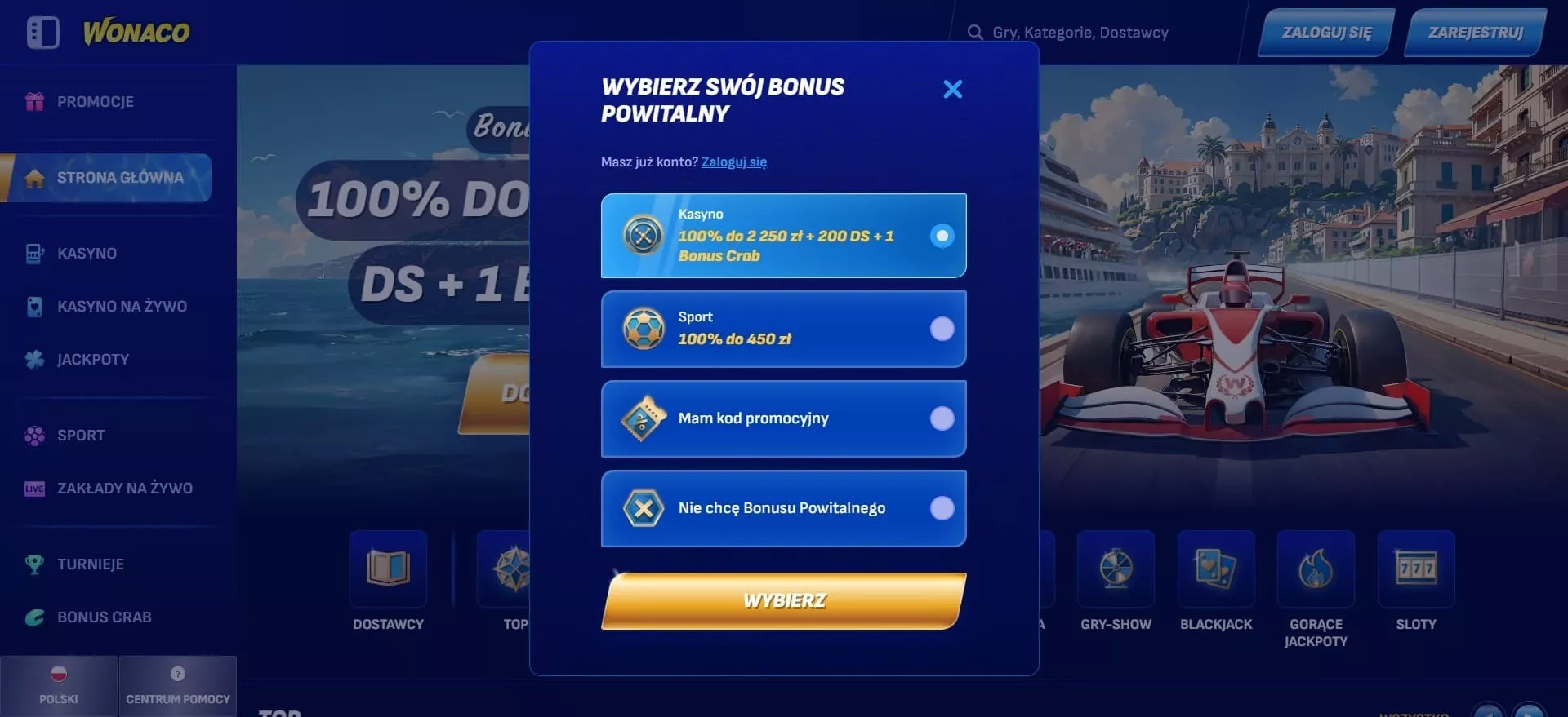 Główna premia w Wonaco kasyno to bonus powitalny. Przy wpłacie pierwszego depozytu w wysokości 90 PLN gracz otrzyma:
