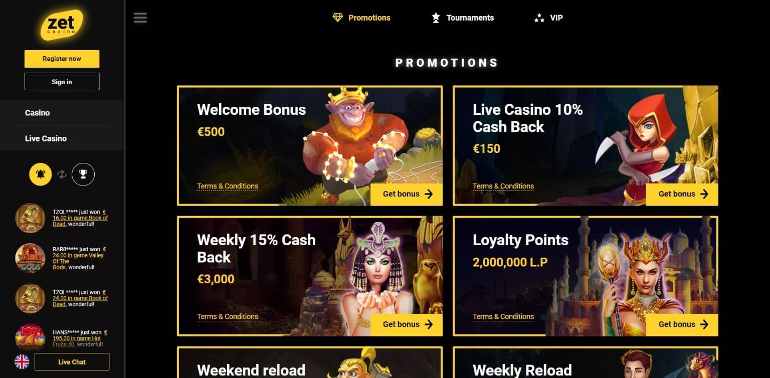 Wszelkie informacje na temat bonusów i promocji zawiera oficjalna strona ZetCasino. W dziale z promocjami można znaleźć szczegółową listę wszystkich aktualnych ofert, wśród których na uwagę zasługują przede wszystkim: